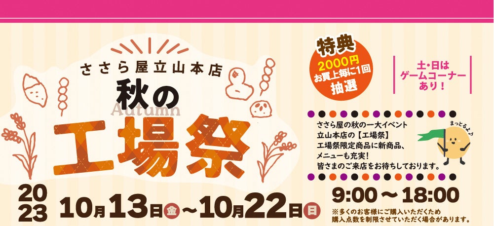 【ささら屋立山本店 秋の工場祭】富山米100%の秋の味覚が勢ぞろい! 2023年10月13日(金)~22日(日)までの10日間 日の出屋製菓産業