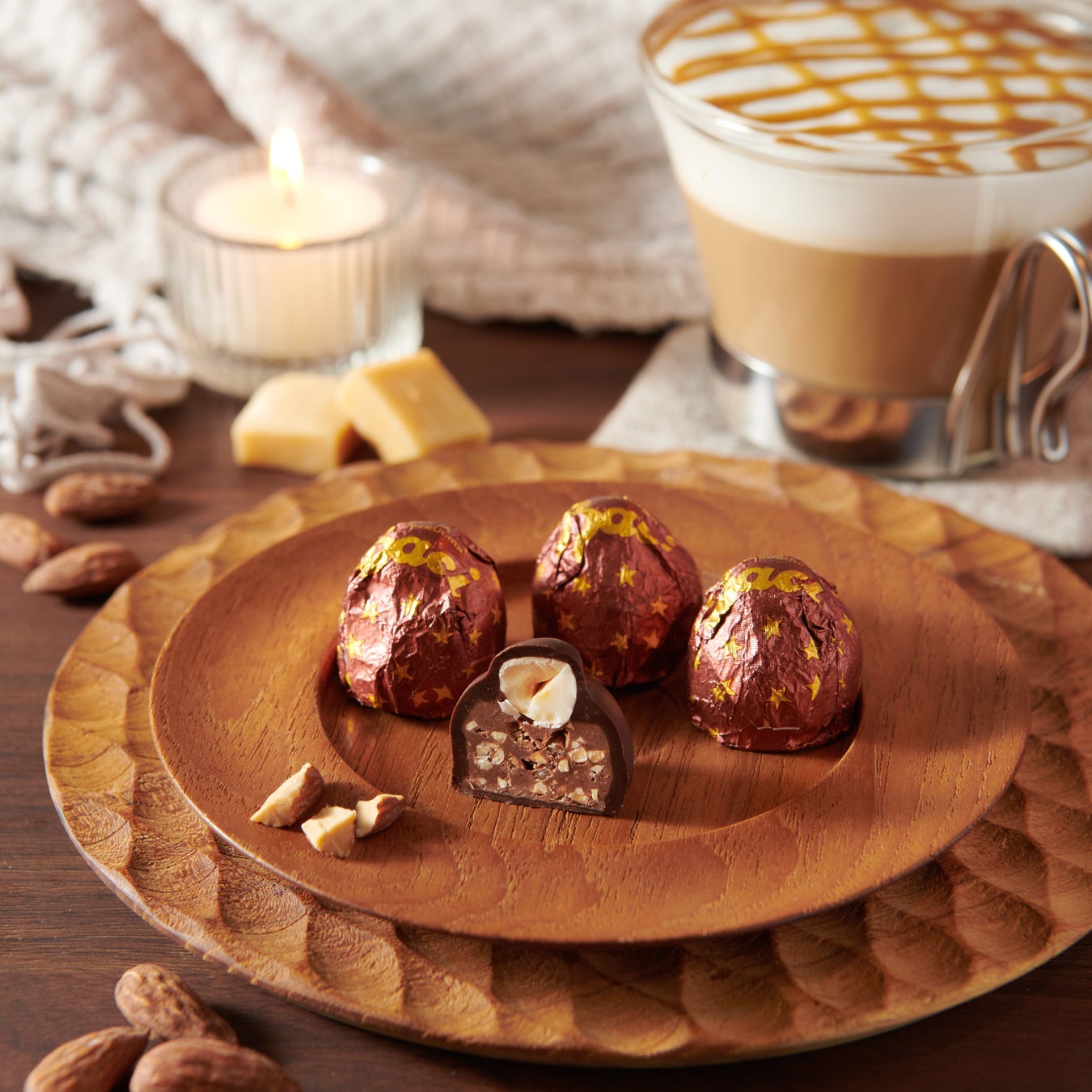 キャラメリゼしたアーモンドとヘーゼルナッツを練り込んだジャンデューヤに、丸ごとヘーゼルナッツをのせ、キャラメル香るダークチョコでコーティング。イタリア伝統菓子アーモンド・クロッカンテに着想を得た、秋冬にぴったりの贅沢なチョコレートトリュフです。