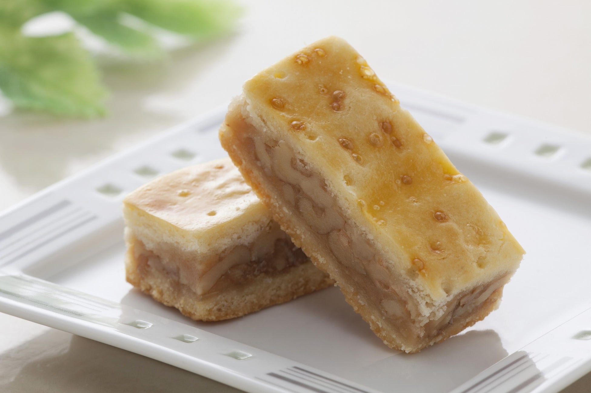バター風味のクッキー生地で、たっぷりのくるみと生キャラメルをサンドしたスイス伝統の焼き菓子です。