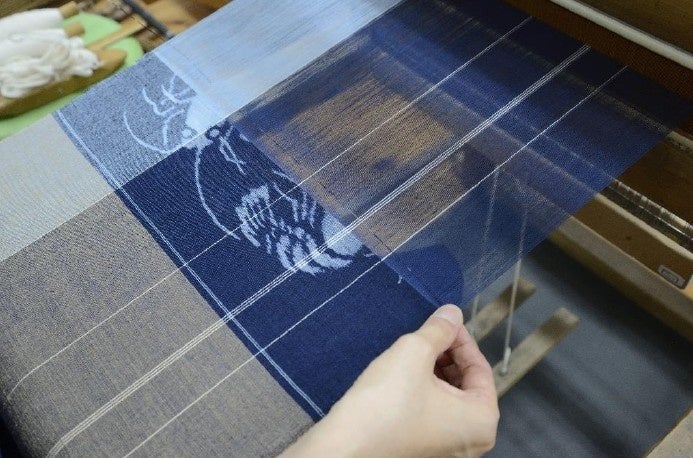 弓浜絣(ゆみはまがすり)は米子市から境港市にかけて弓状の弧を描く約20kmの巨大な砂嘴(さし)「弓ヶ浜」で江戸時代から続いている藍色に白抜きの模様が映える木綿の絣です。