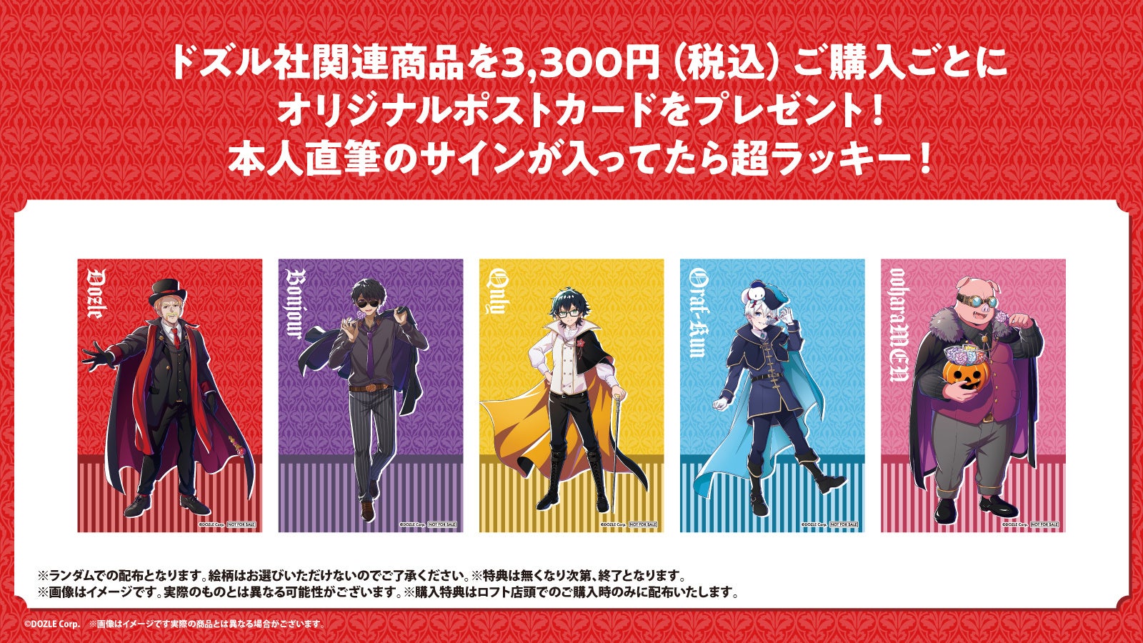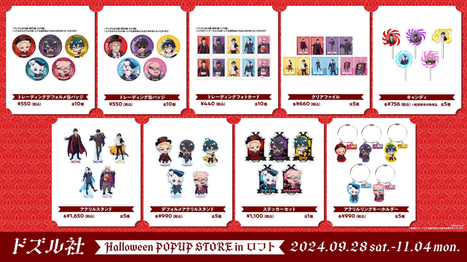 全店舗で、ドズル社メンバーがヴァンパイアに変身した描き下ろしビジュアルのオリジナルグッズを販売します。一部店舗で、ドズル社オフィシャルグッズを販売します。