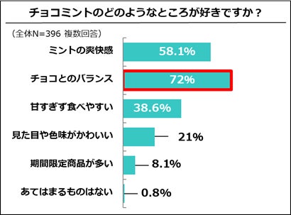 その結果、チョコミント好きの72%が「チョコとミントのバランス」が好きと回答し、最多となった一方で、チョコミント未経験者の約76%が苦手意識を持ち、食べず嫌いの傾向があることがわかりました。