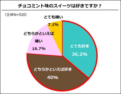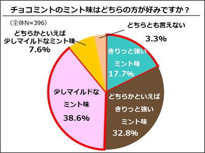 また、チョコミントのミント味として好ましいのは、「きりっと強いミント味」が約18%。「少しマイルドなミント味」が約39%で、総じて「チョコとミントのバランス」、「まろやかなミントの味」がチョコミントに求められていることが明らかになりました。