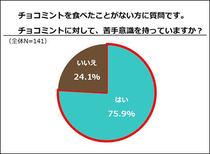 チョコミント未経験者は661人中141人の約21%と、5人に1人はチョコミントを食べたことがない人がいました。さらに、そのうち、チョコミントに苦手意識を持っている人は約76%で、4人のうち3人が“食べず嫌い”であることが分かりました。