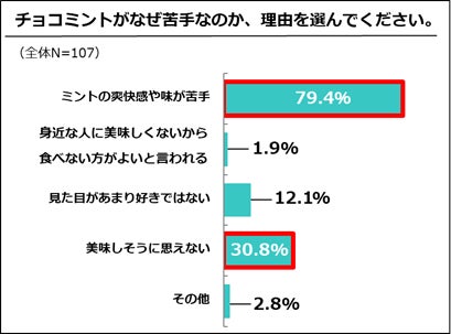チョコミントに苦手意識を持つ食べず嫌いの人のうち、約80%が「ミントの爽快感や味が苦手」と回答。また、「美味しそうに見えない」と見た目で判断して食べていない人が約31%いることが分かりました。