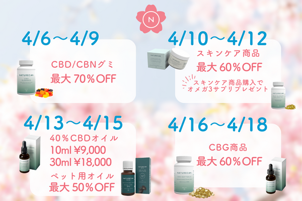 4月6日から、高濃度40%CBDオイルをはじめとした人気商品がお得に購入できるセールをNaturecan公式サイトで開催。10日~12日は無料プレゼントキャンペーンも実施!