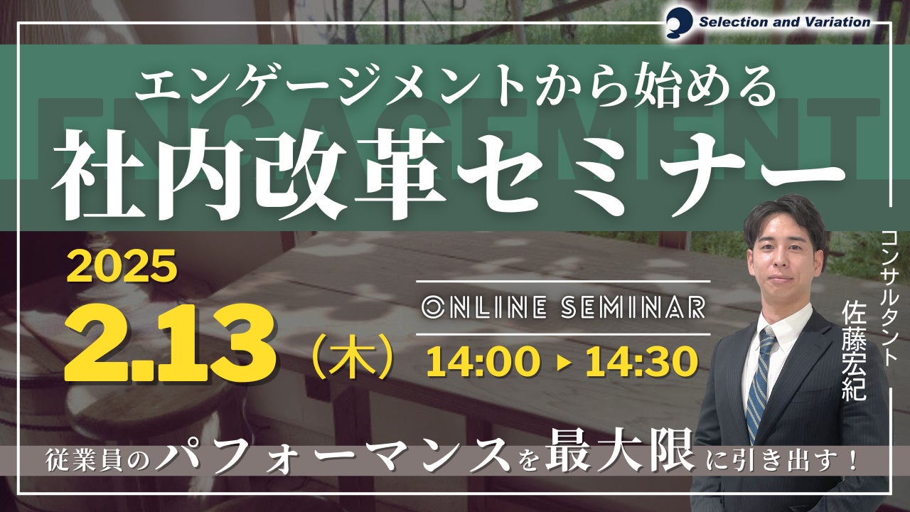 組織・人事コンサルティングファームであるセレクションアンドバリエーション株式会社(以下、当社、東京都千代田区丸の内、大阪市西区、名古屋市西区 / 代表取締役社長:平康慶浩/ URL:https://sele-vari.co.jp/ )は<従業員のパフォーマンスを最大限に引き出すための 「エンゲージメントから始める社内改革セミナー」>を2025年2月13日(木)14:00〜14:30に開催することをお知らせいたします。