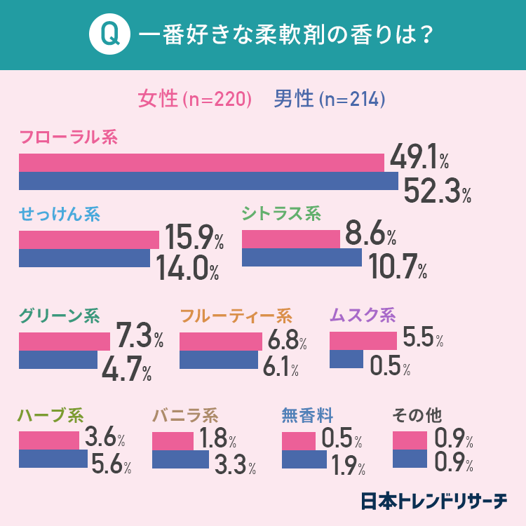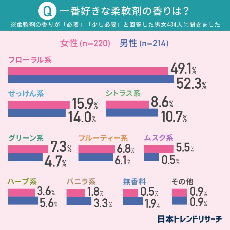 柔軟剤の好きな香りの調査では男女ともに「フローラル系」がもっとも人気で、その理由は自然で柔らかい印象になるからや、他の洗剤と混ざっても嫌なニオイにならないからなどがあるようです。