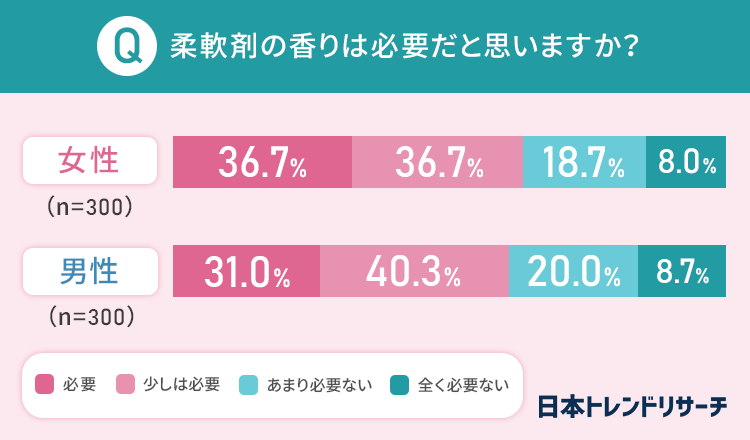 柔軟剤の香りについては、「必要」「少しは必要」を合わせて女性は73.3%、男性は71.3%となった一方で、「全く必要ない」と思っている方も約8%程度いました。