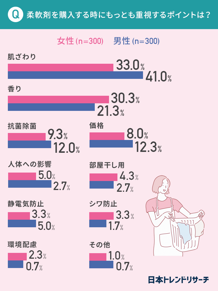 また、柔軟剤を購入する時のポイントとしては、「肌ざわり」や「香り」を重視する方が多い結果になりました。