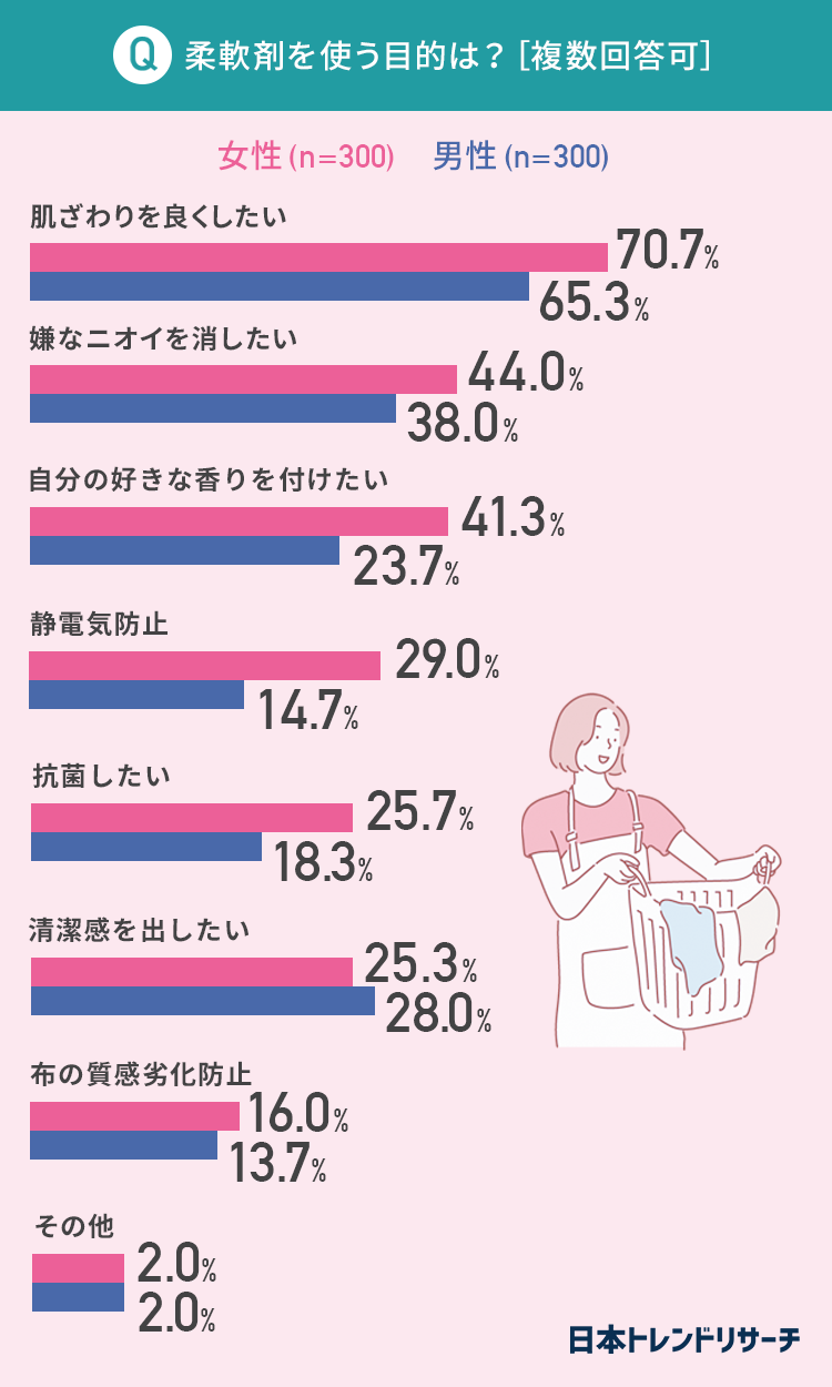 - 洗剤だけより柔軟剤の匂いがある方が洗濯した満足感を得られるため(20代・女性)