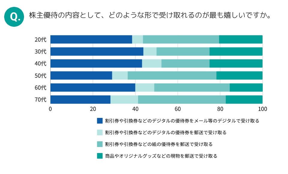 当社が2024年10月に実施した「株主優待に関する意識調査」(※) によると、郵送形式の優待券等を希望する株主が一定数いる一方で、デジタル形式を希望する株主も多く、年代によっては半数近くがデジタル形式を希望しています。