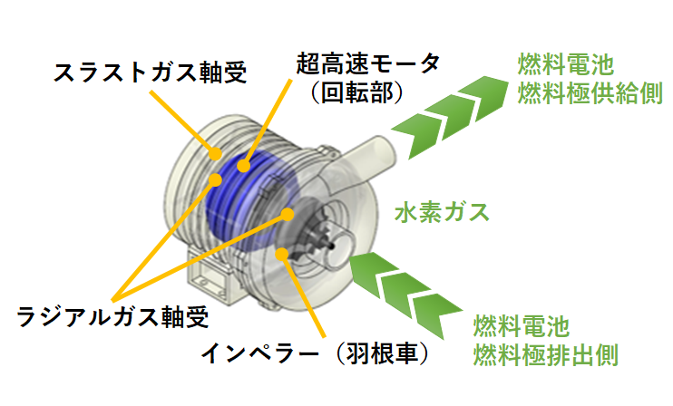 本開発には,航空機燃料電池向けとして大量の水素ガスを回収するために,独自開発のガス軸受を用いた超高速モータ(図2)を採用しています。これにより,再循環装置の大容量(高効率)化かつ小型化,軽量化を実現しました。ガス軸受は,潤滑油を使用しないため,潤滑油で水素を汚染することがありません。