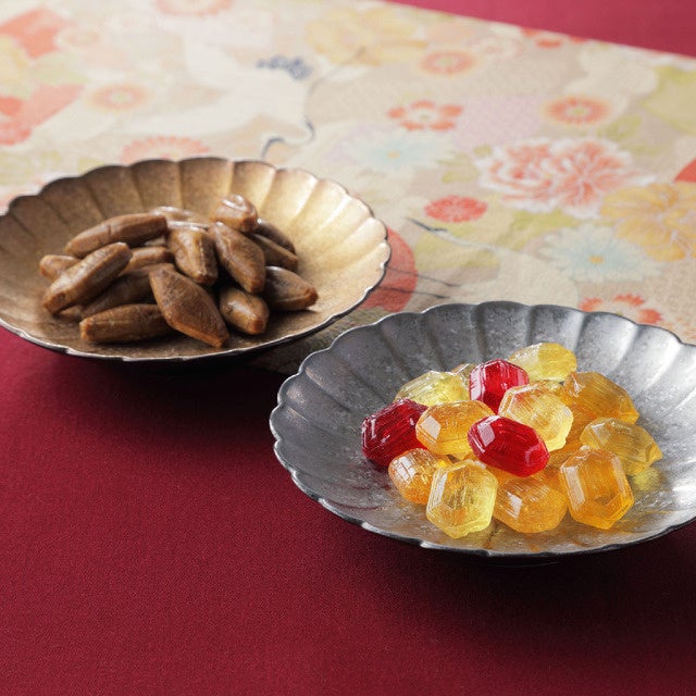 梅ぼ志飴をおめでたい亀甲形の「ことぶき飴」に、黒飴を縁起のよい鰹節形の「かつぶし飴」のセットは、
