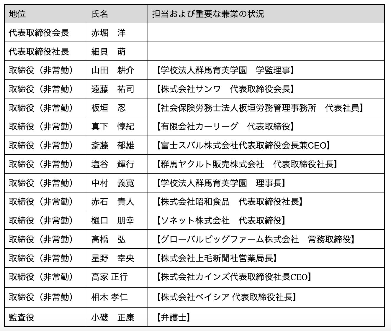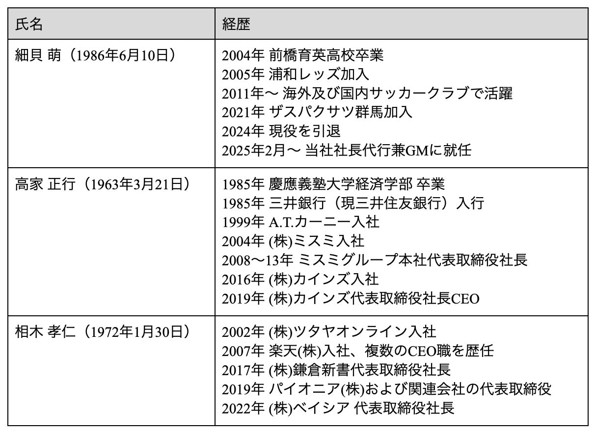さらに、経営面では現在の取締役陣に加えて、代表取締役社長兼GMに細貝萌氏、取締役として高家正行氏(株式会社カインズ代表取締役社長CEO)、相木孝仁氏(株式会社ベイシア代表取締役社長)が就任し、経営体制を強化し、より積極的な運営を行ってまいります。