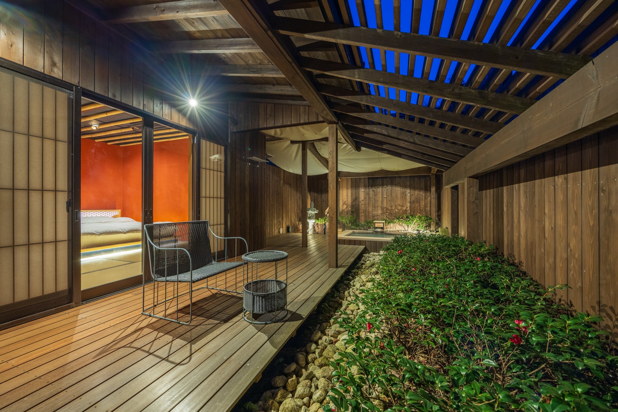 そのコンセプトは、同グループ施設「金乃竹 仙石原」が描く『竹取物語』の世界観を、より気軽に体験していただくこと。全6室のうち4室は客室専用の露天風呂付き、さらに2階の2室には専用の貸切露天風呂をご用意。いずれも白濁の源泉かけ流し温泉をお愉しみいただける、上質な空間となっております。