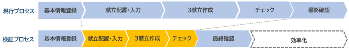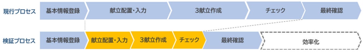 献立案作成後の確認工程が複雑であり、修正が発生すると関連箇所への影響が連鎖的に広がり、複数の修正対応が必要となる。その結果、全体の修正作業に時間を要するケースがある。