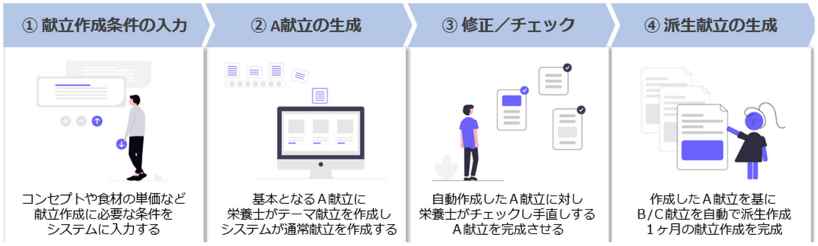 栄養基準、コスト等の各種制約条件 および、それらの優先順位に基づき、可能な限り制約を満たす献立案を自動生成する。また、解が得られない場合には、優先順位の低い制約から段階的に緩和することで、現実的な献立案を提示するなどの措置を講じる。