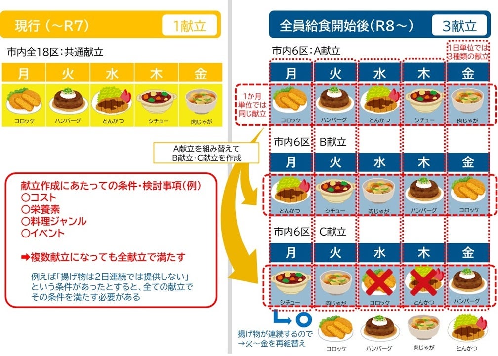 令和7年度までは1日あたり1献立(市内全域で同じ)ですが、全員給食が始まる令和8年度以降、給食提供数が約8万食へと大幅に増加するため、安定的に日々の食材を調達できるよう、1日あたり3献立(アレルギー代替食を含めると5献立)で給食を提供します※。