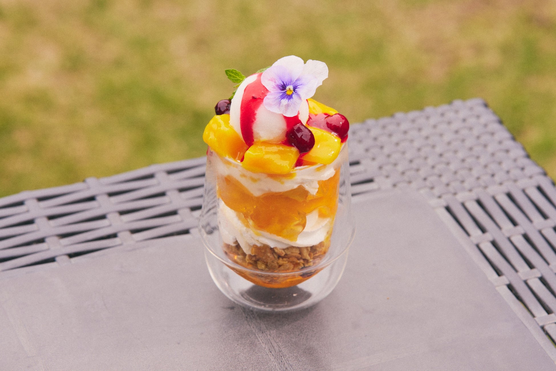 完熟マンゴーと、彩り豊かな旬のトロピカルフルーツを贅沢に使用した、見た目も華やかで贅沢なパフェに仕上がりました。一口食べれば、口いっぱいに広がる南国の香りと、ジューシーな果肉のハーモニーが、暑い夏にぴったりの爽やかさを演出します。マンゴーの濃厚な甘みと、チェリーソースやライチシャーベットなど、様々なフルーツの酸味が絶妙に調和し、最後まで飽きることなくお楽しみいただけるパフェとなっています。