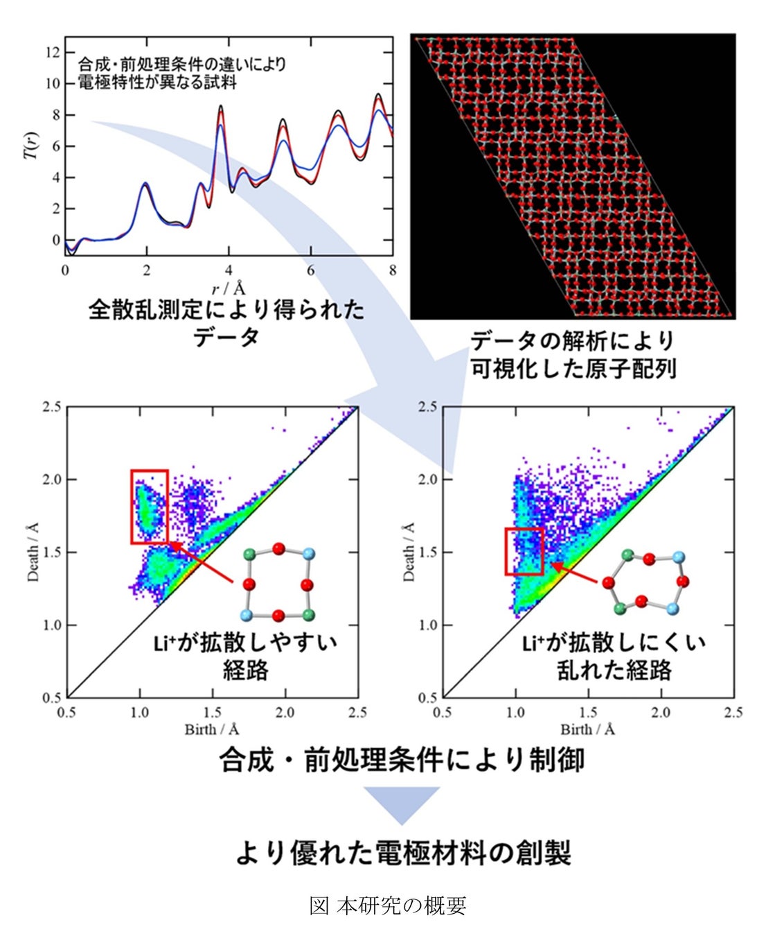 近年、車両用リチウムイオン電池の負極材料として、Wadsley–Roth相を形成するTiNb2O7(TNO)に注目が集まっています。TNO結晶中では、リチウムイオンが比較的自由に移動できる空隙があり、高速でのイオン輸送が可能になるため、エネルギー貯蔵材料として非常に有用であると考えられています。一方で、原子配列と負極特性に関する詳細は未解明のままでした。そこで本研究グループは、TNOの構造と負極特性の相関について明らかにすべく、中性子・X線全散乱測定とパーシステントホモロジーに基づくトポロジー解析を行いました。