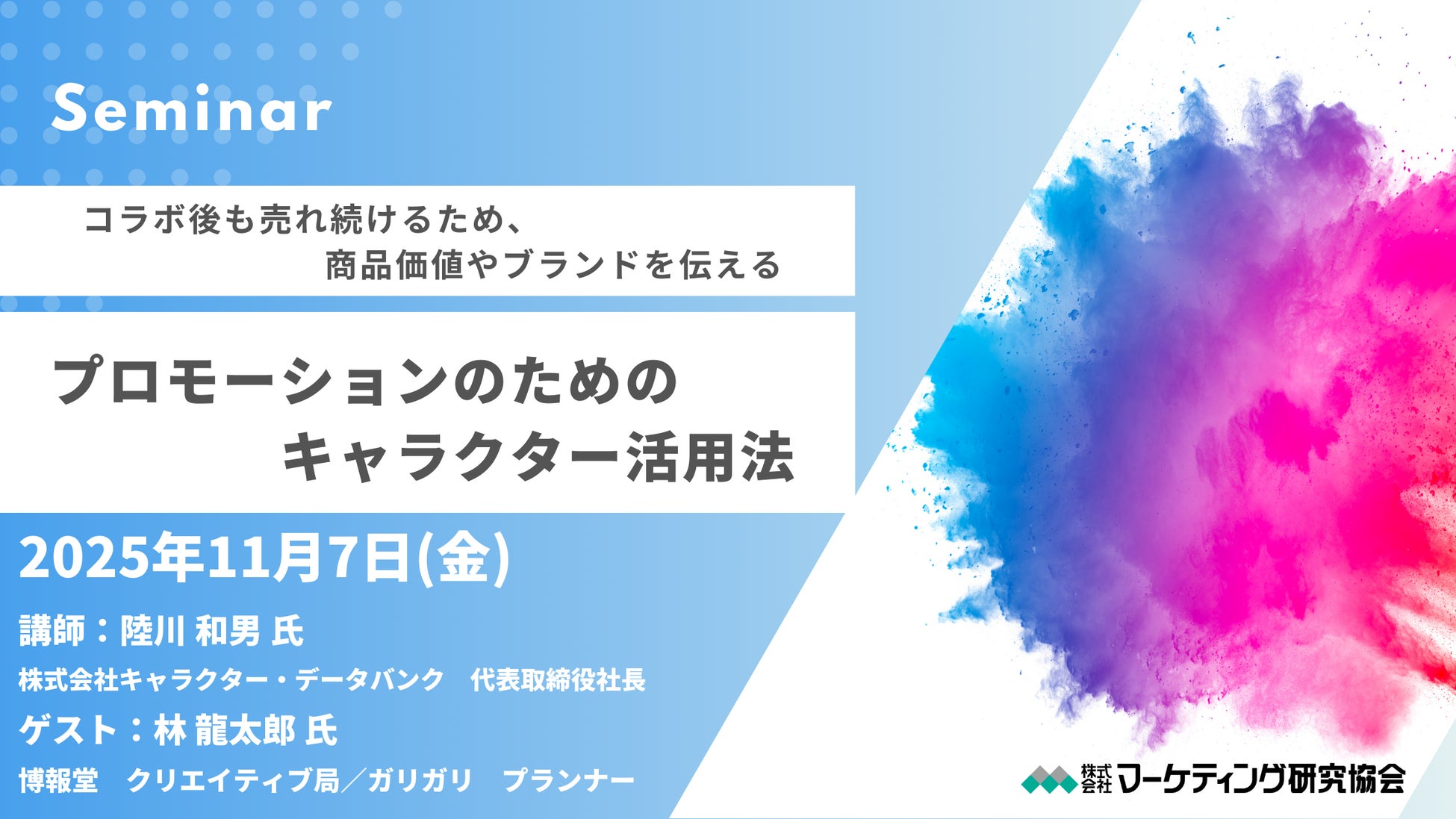 株式会社マーケティング研究協会は2025年11月7日オンラインセミナー「コラボ後も売れ続けるため、商品価値やブランドを伝える!プロモーションのためのキャラクター活用法」を開催します。