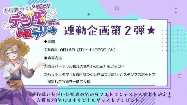 スタンプを集めると AR(※現実世界に仮想世界を重ね合わせて表示する技術)でフォトフレームなどが出現し、春日部つくしさんや埼玉県ご当地VTuberと一緒に写真撮影ができます。