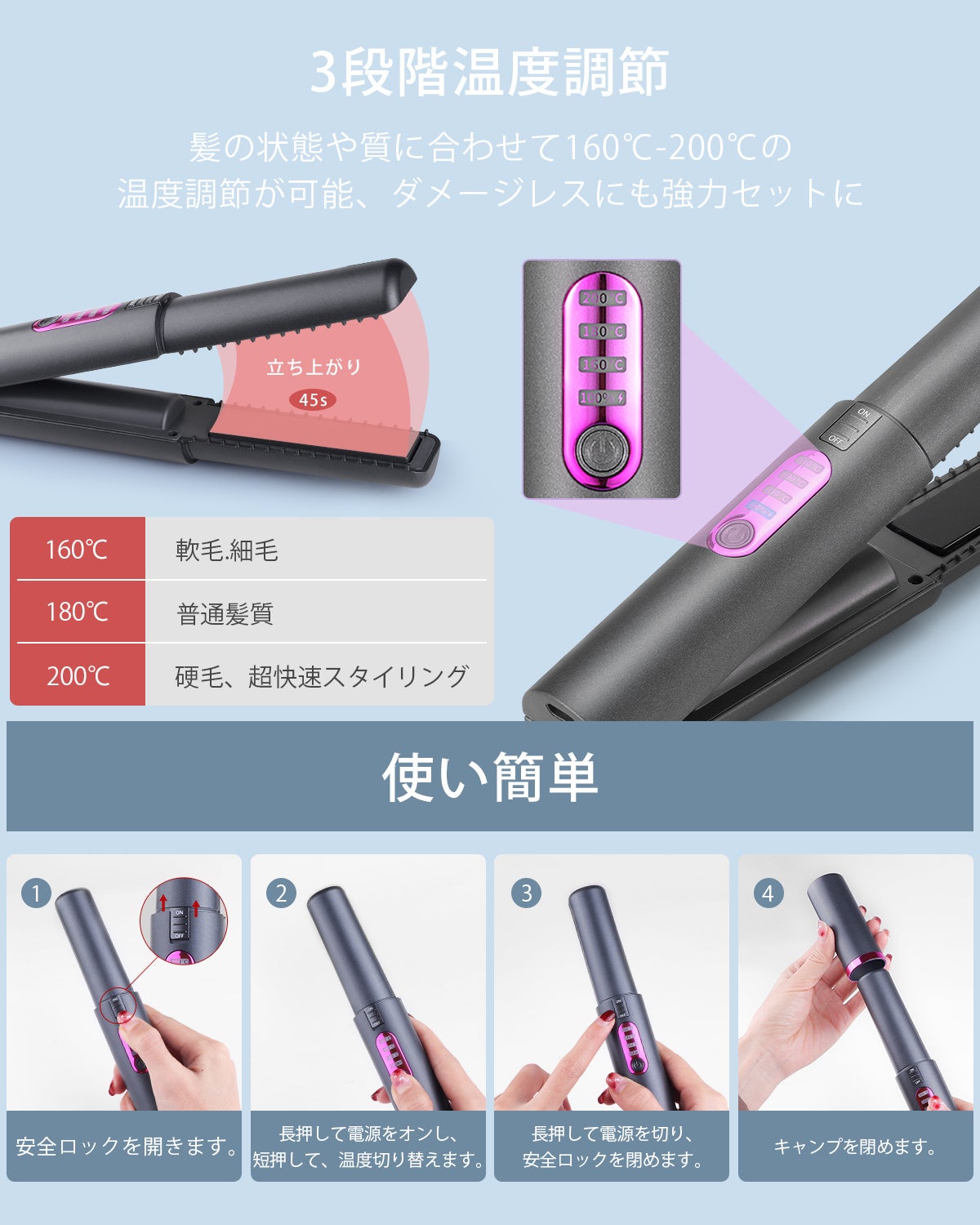 【より立ち上がり速い、使用時間の短縮】 本製品は立ち上がりが速いです。発熱設計は0.3 mmセラミック鋼片を採用し、現在唯一無二の設計革新理念を持っています。昇温速度に遅れはなかった。市場同業者の発熱に使用されている1.2 mm厚アルミニウム材質と比較して、本製品は薄い鋼+セラミックス材質を採用し、発熱速度が最も速い、伝導速度が2倍速いです。現在、Amazonにはほかのコードレスヘアアイロンでは200度までの立ち上がり時間は150秒ですが、弊社のワコードレスヘアアイロンは200度まで立ち上がり、立ち上がり時間はただ75秒です。電源コード式ヘアアイロンとほぼ同じです。(スタイリングをすると、この間、温度は時間内に補充されます)。