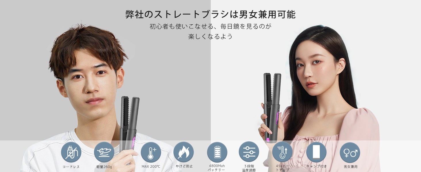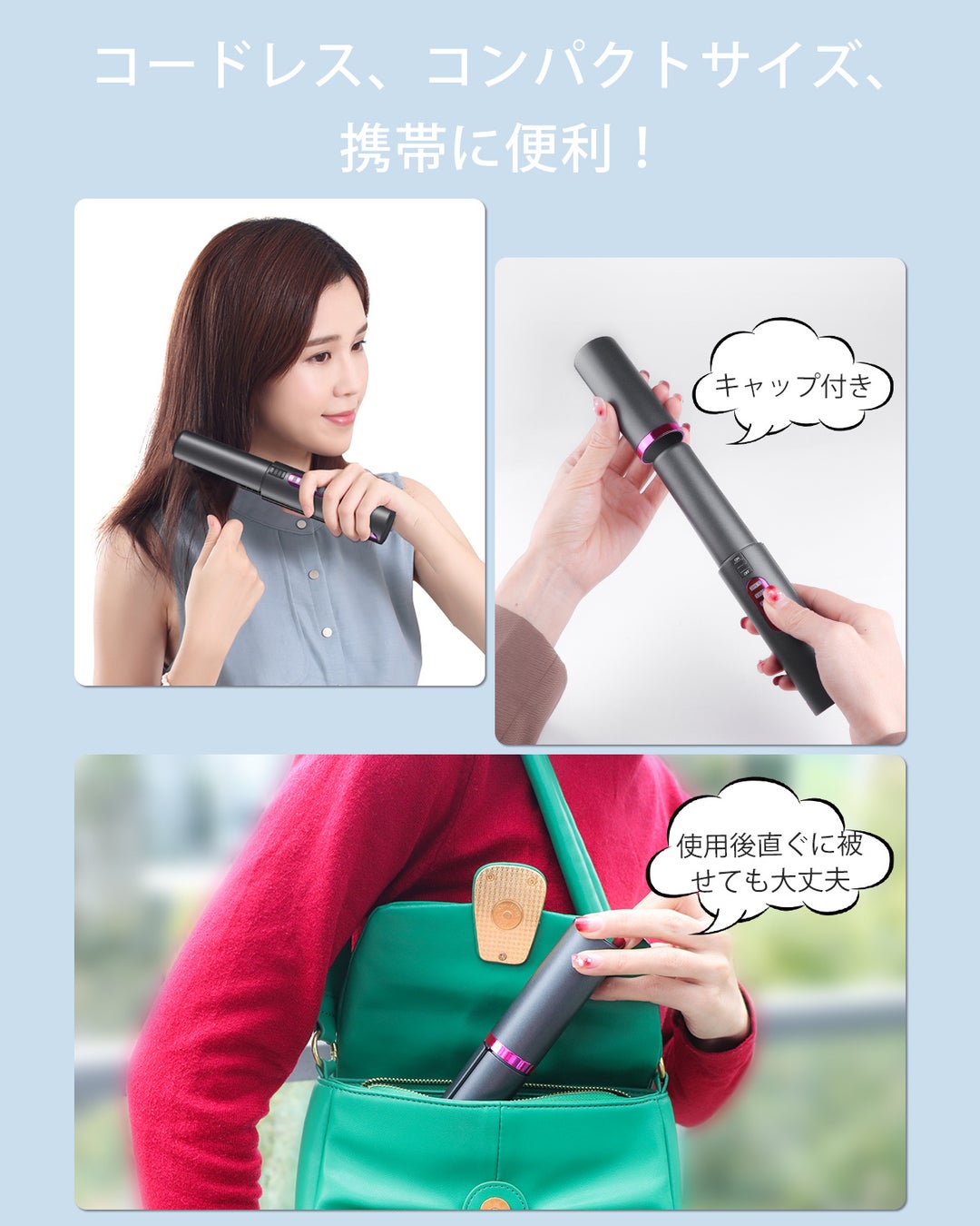 【コードレス充電式ストレートヘアアイロン】重量は約260g、本体は20cmx3.5cmの小さいヘアアイロンなので、また、コンセントを挿せなくても使えるコードレスヘアアイロンは、普段のバッグにもすっぽり収納できます。出先での化粧直しにイチオシ!髪を挟む部分がなだらかな曲線なので、ストレートとカールの2wayで使えます!充電式なので、いつでも・どこでも気軽にスタイリングできます。