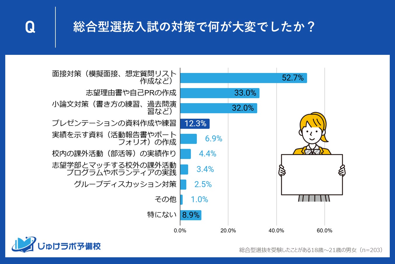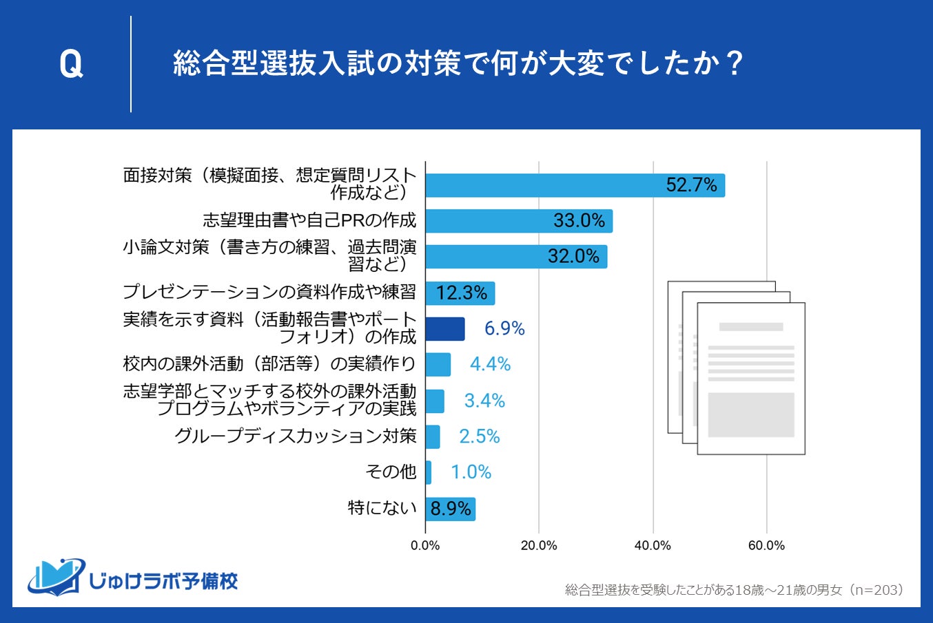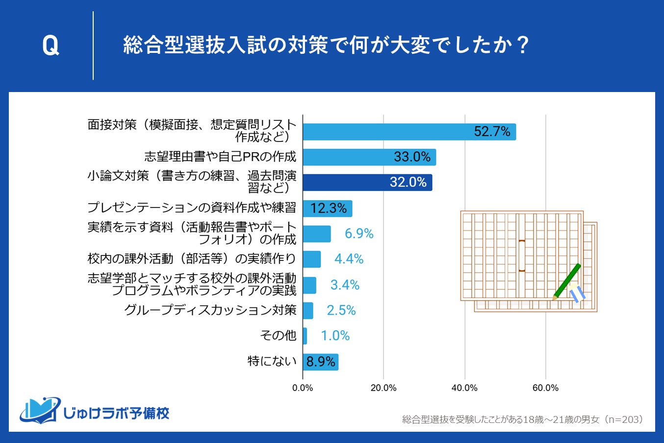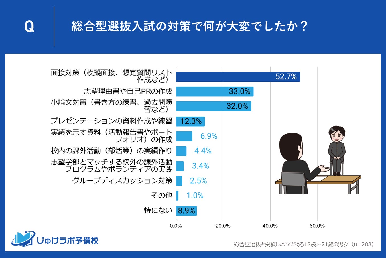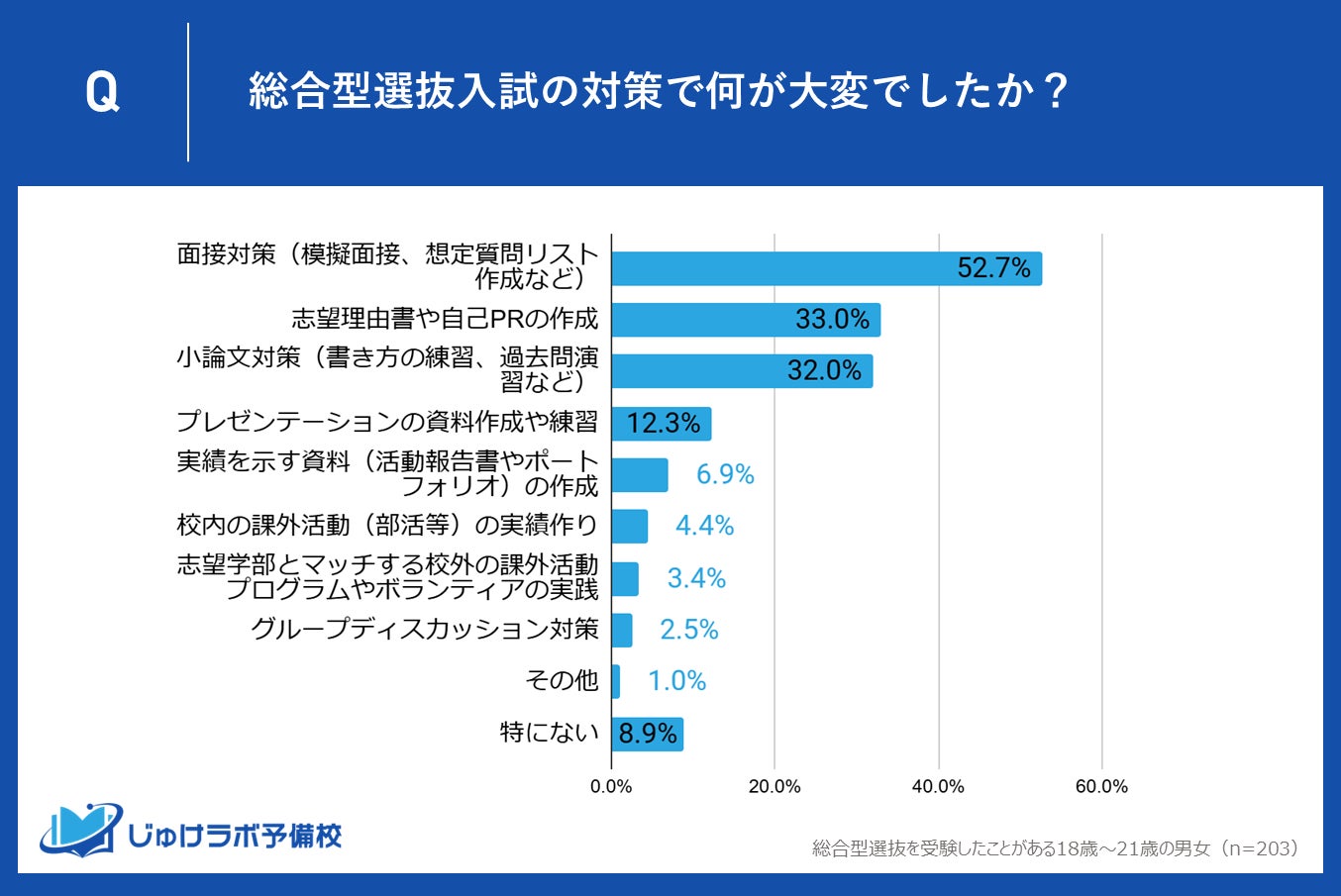 今回、総合型選抜入試を経験した18〜21歳の男女203人を対象に調査を実施。その結果、最も大変だった対策として「面接対策」が52.7%と突出していることが明らかになりました。志望理由書や小論文対策も上位にランクインし、受験生のリアルな苦労が浮き彫りになりました。