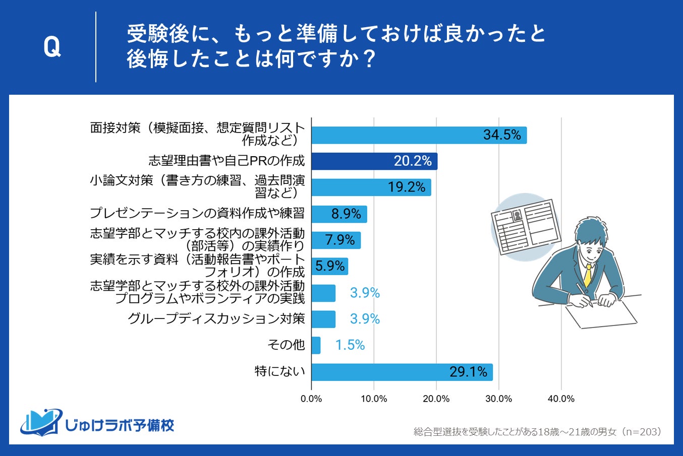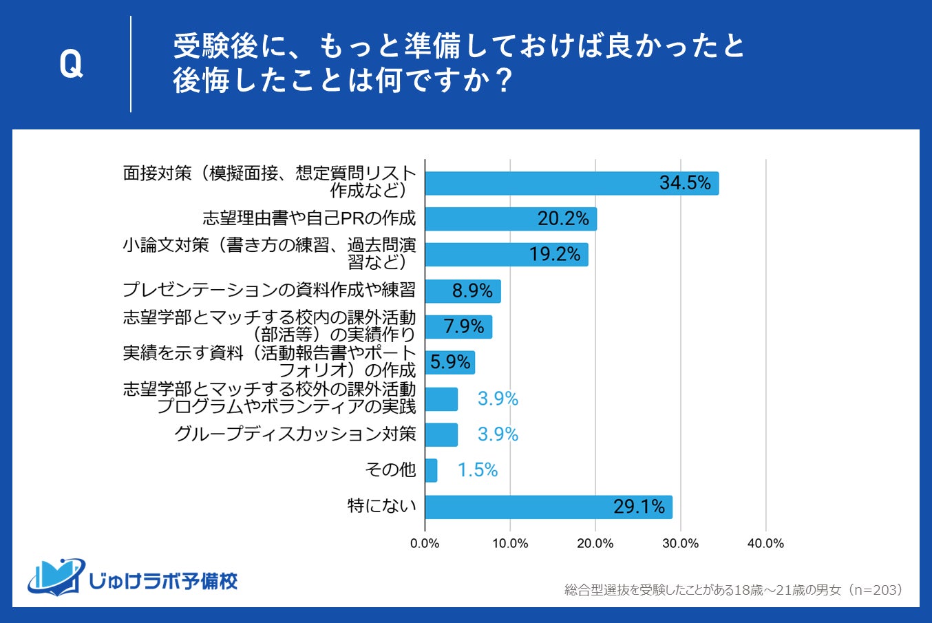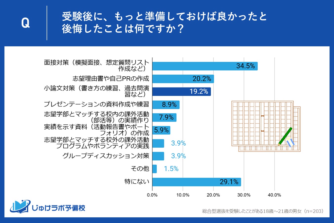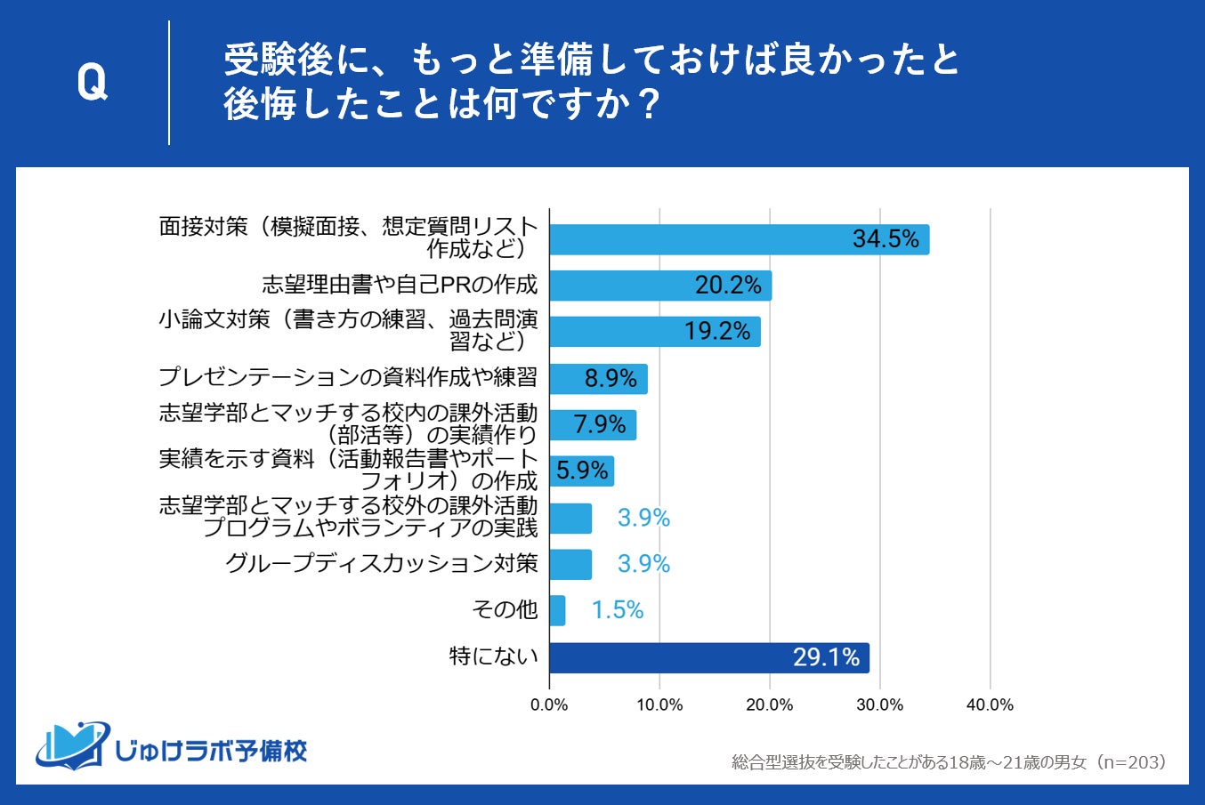 次に、総合型選抜入試の受験後に最も後悔した対策を調査した結果、「面接対策」(34.5%)が最も多く、次いで「志望理由書や自己PRの作成」(20.2%)、「小論文対策」(19.2%)が続く結果となりました。 一方で、「特にない」と回答した受験生も29.1%にのぼることが判明しました。
