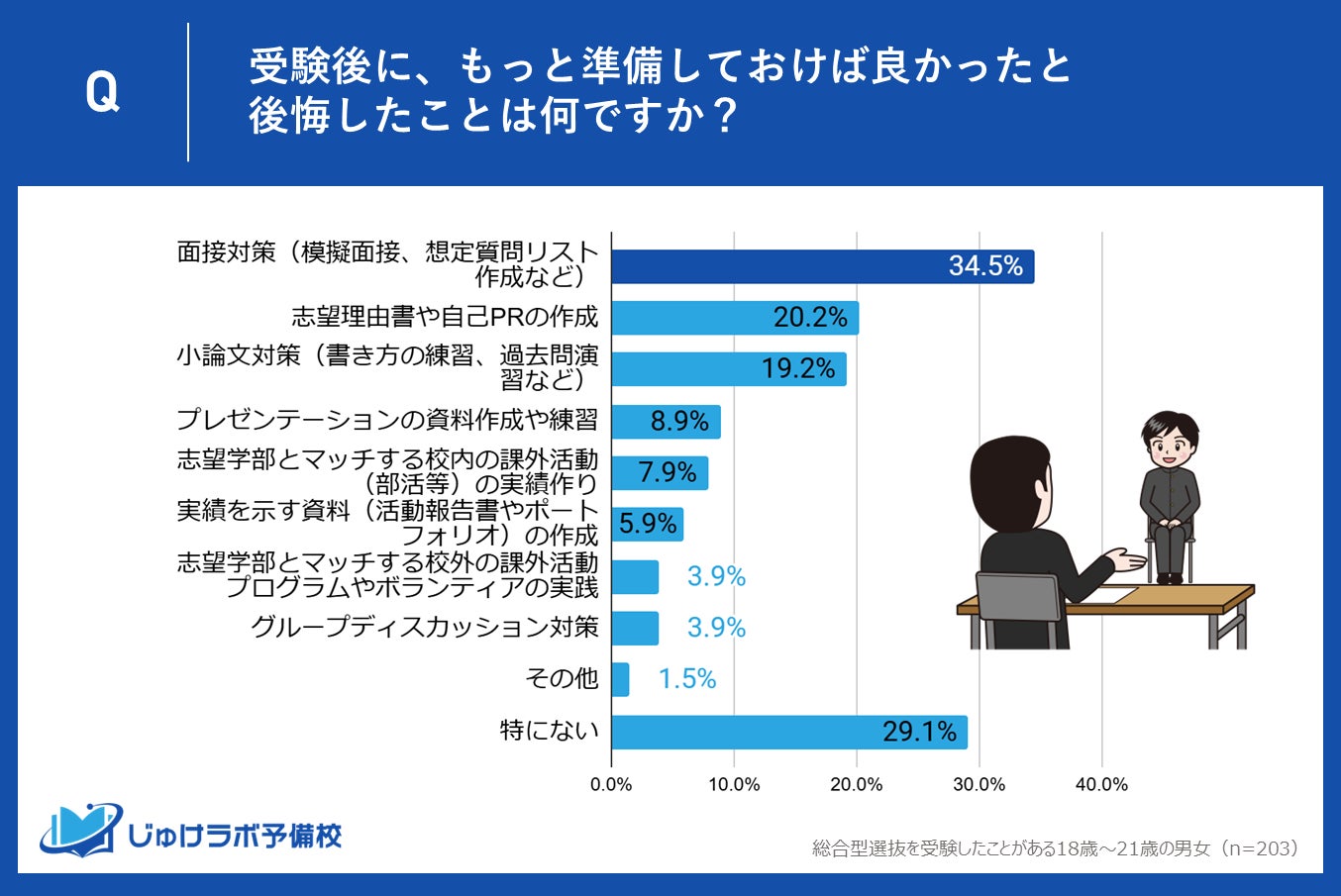 調査結果によると、「面接対策」(34.5%)が最も多くの受験生にとって後悔した対策でした。総合型選抜入試では、面接が重要な評価項目のひとつであり、受験生自身の考えや経験を自分の言葉で伝えることが求められます。