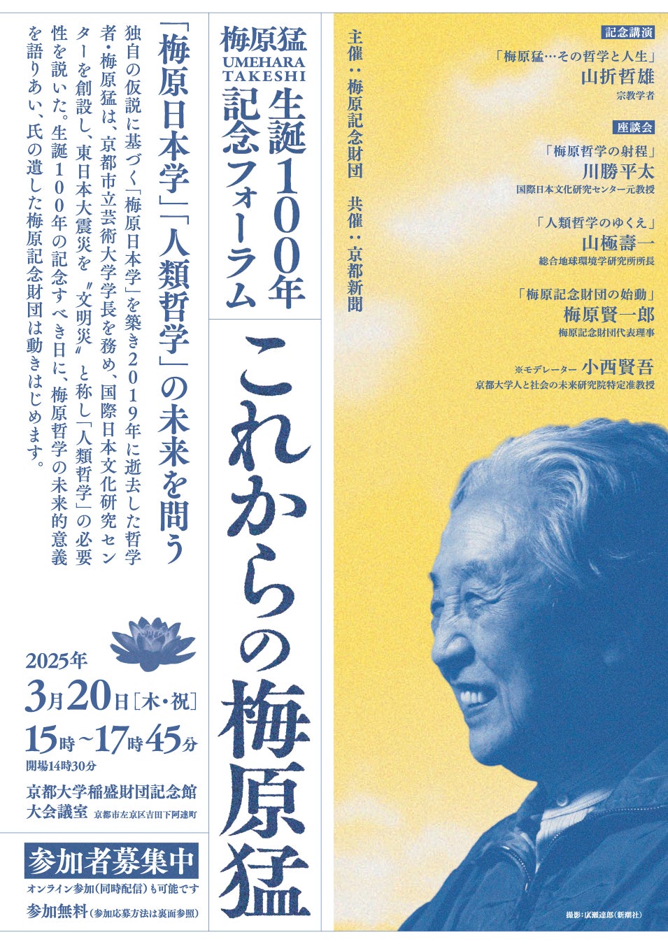 独自の仮説に基づく「梅原日本学」を築き2019年に逝去した哲学者・梅原猛氏は、京都市立芸術大学学長を務め、国際日本文化研究センターを創設しました。東日本大震災を“文明災”と称し、「人類哲学」の必要性を説きました。生誕100年の記念すべき日に、梅原猛氏の謦咳に接した方々が集い、梅原哲学の未来的意義を語り合います。会場参加またはオンラインでの参加者を募っています。参加は無料です。