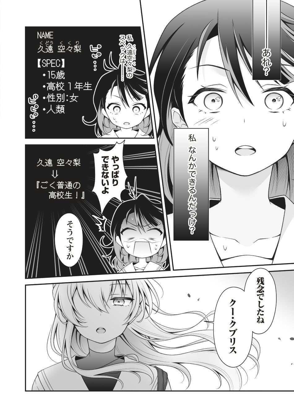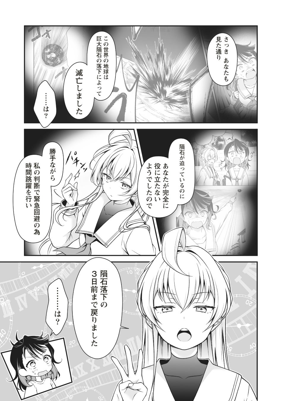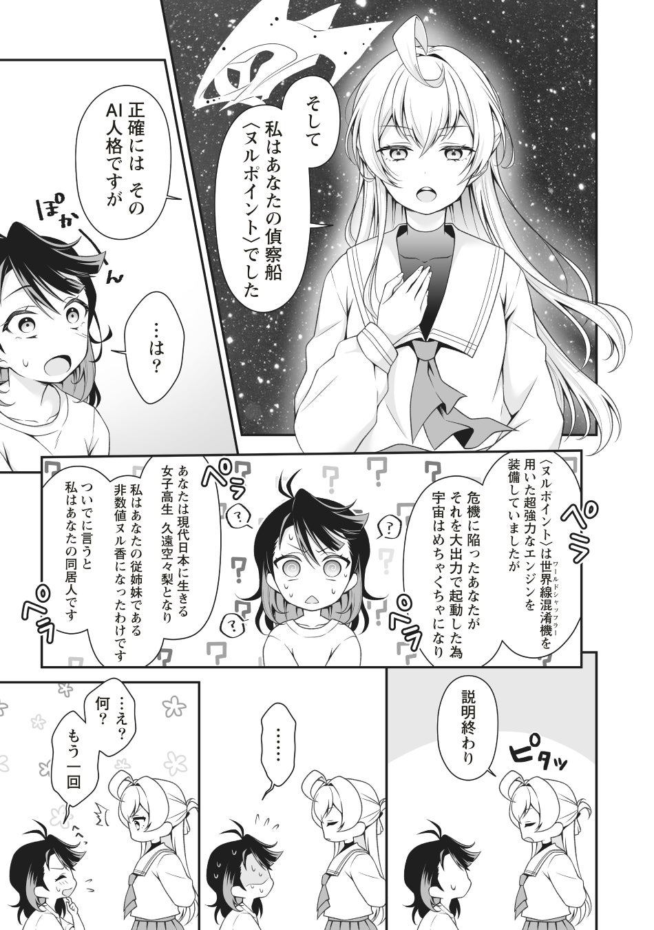 女子高生・久遠空々梨(くどうくくり)は下校中、巨大隕石の落下に遭遇し、 全人類は一瞬にして滅亡してしまう。 ――が、目を覚ますと、そこはなぜか衝突の3日前。 混乱する空々梨に対し、従姉妹の非数値ヌル香(ひすうちぬるか)は 衝撃の事実をつきつける――。 普通の女子高生だった彼女が、実は星間諜報組織のエージェントだった!? 宇宙がヤバイ大活劇、堂々スタート!!