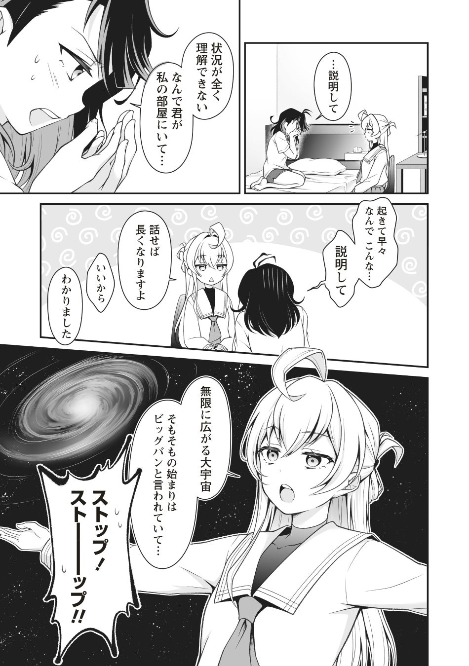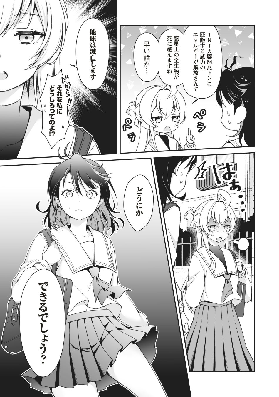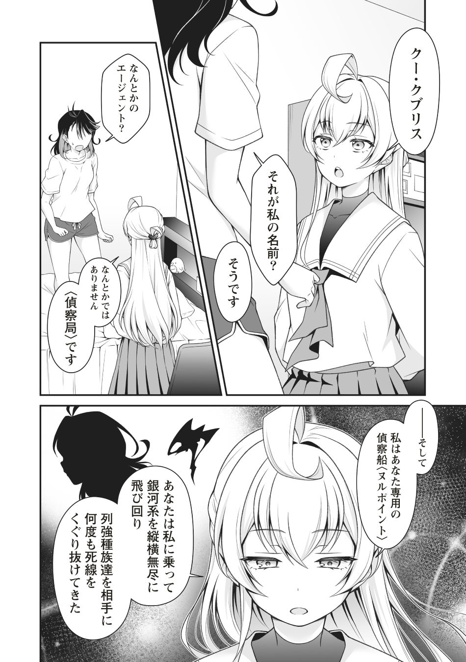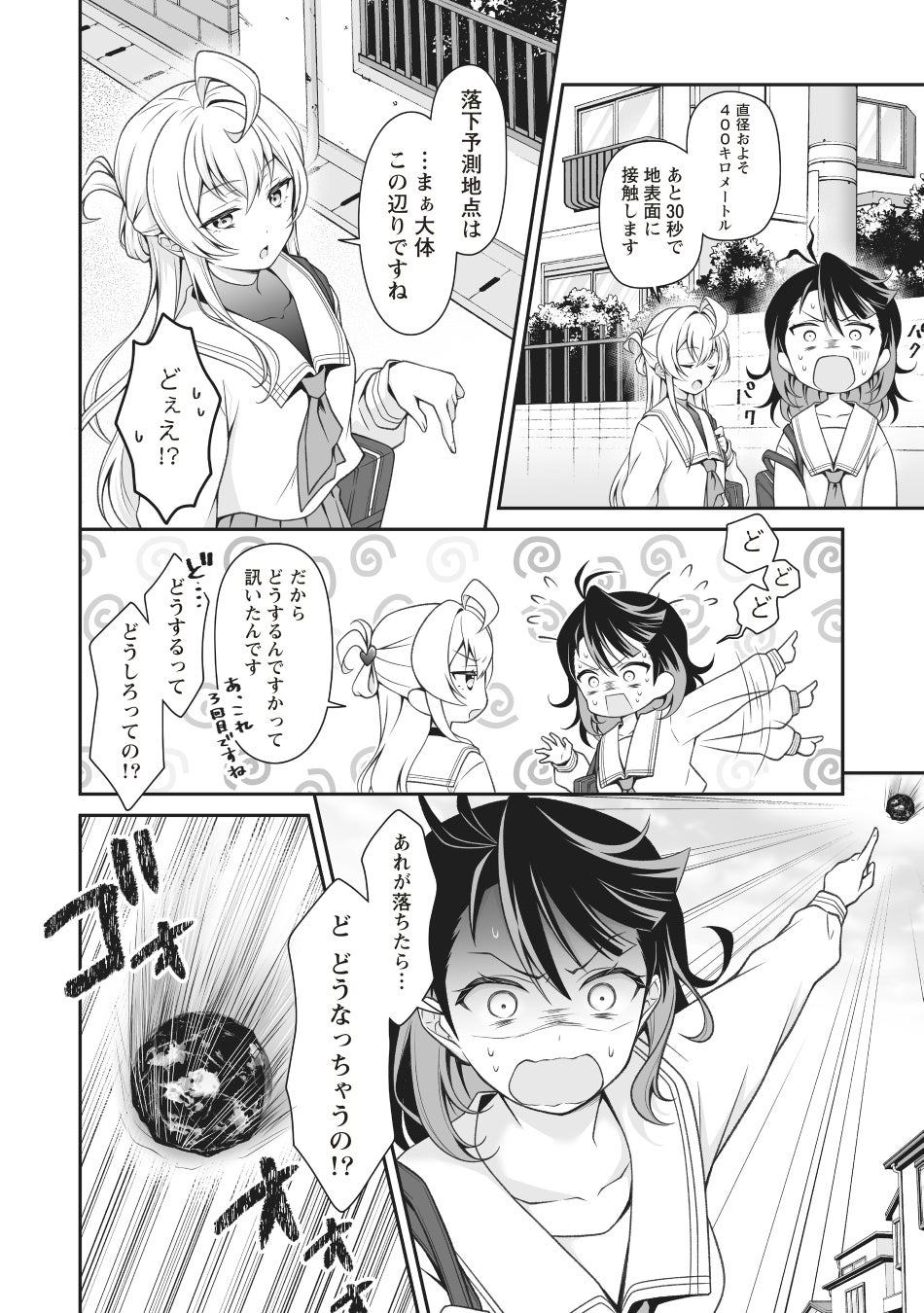 女子高生・久遠空々梨(くどうくくり)は下校中、巨大隕石の落下に遭遇し、 全人類は一瞬にして滅亡してしまう。 ――が、目を覚ますと、そこはなぜか衝突の3日前。 混乱する空々梨に対し、従姉妹の非数値ヌル香(ひすうちぬるか)は 衝撃の事実をつきつける――。 普通の女子高生だった彼女が、実は星間諜報組織のエージェントだった!? 宇宙がヤバイ大活劇、堂々スタート!!