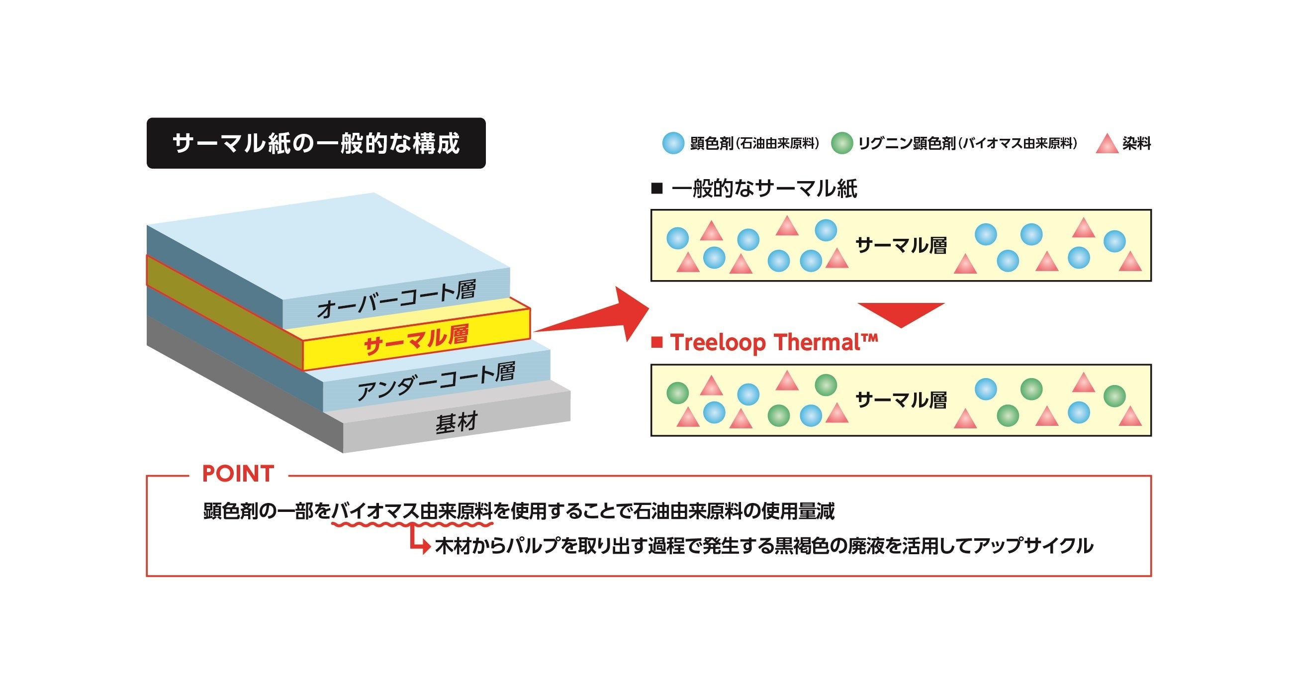 サーマル紙の材料である顕色剤は、一般的に石油由来の原料が使用されています。本製品は、その一部にクラフトリグニンを使用したリグニン顕色剤に置き換えた環境対応製品です。クラフトリグニンとは、木材から パルプを取り出す際に発生する黒液(黒褐色の廃液)に含まれている成分で、廃液を原料として活用することでアップサイクル、さらに石油由来の顕色剤使用を減らすことで環境負荷軽減も実現させました。また、本製品は海外の法規制で使用禁止されているビスフェノールA、使用制限があるビスフェノールSを顕色剤に使用していないため、国内だけでなく海外での販売強化も図っていきます。
