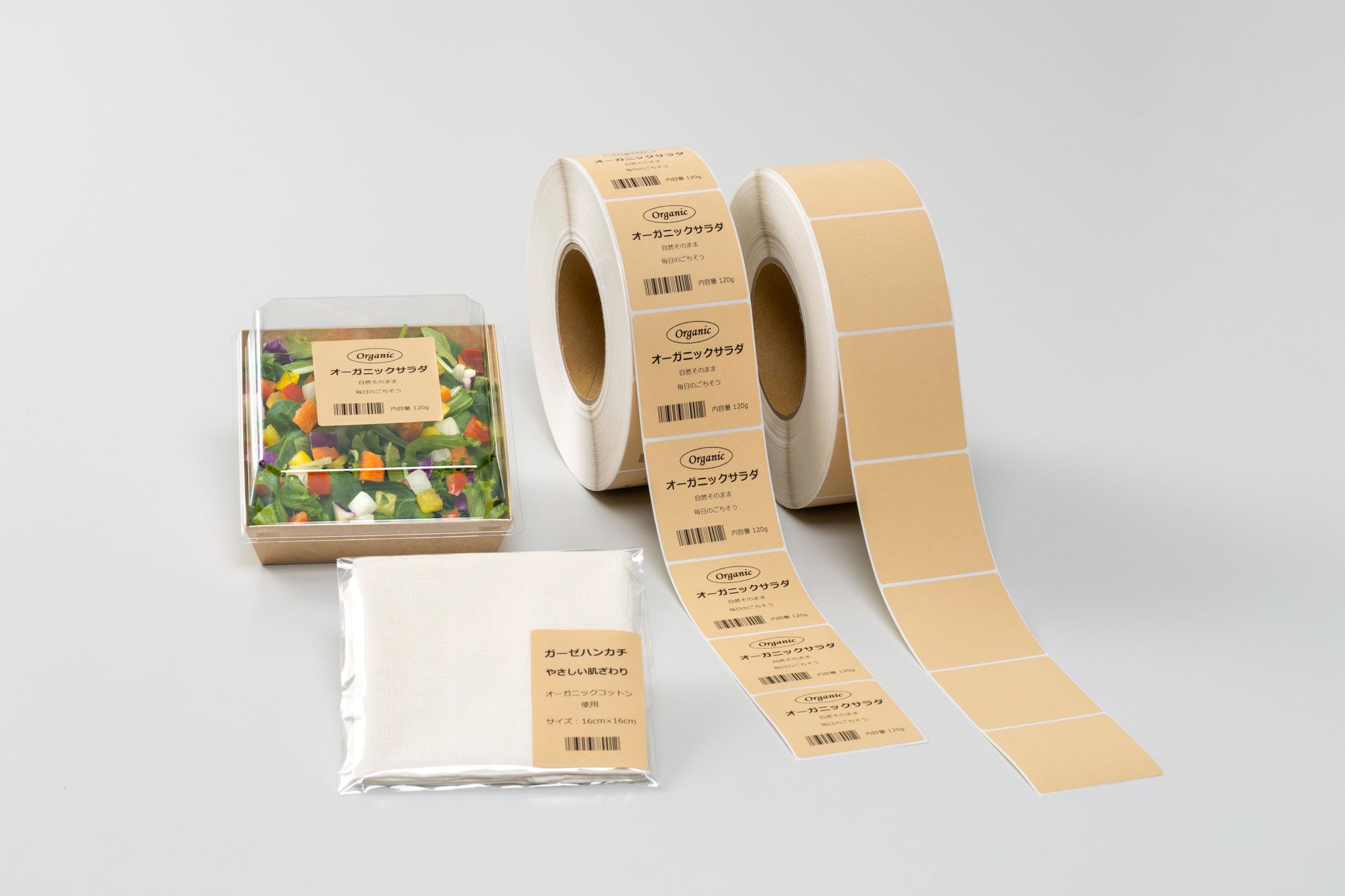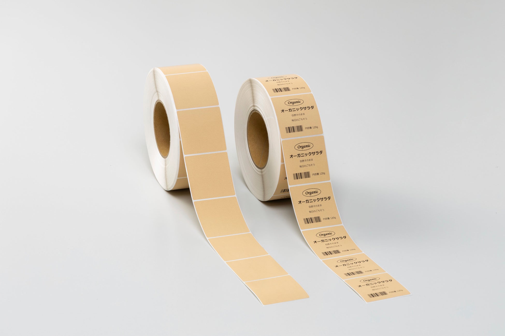 自然志向や環境に配慮した商品の雰囲気に合うように、クラフト紙のサーマルラベルのご要望がありました。しかし、クラフト紙にサーマル層を構成すると温かみのある独特の風合いが損なわれたり、表面のざらつきによりきれいに印字できないという課題がありました。それをクリアにするために本製品の開発に着手しました。触感は一般的なホワイトのサーマルラベルと同等で、ライトブラウンでナチュラルな色合いのラベルを製品化しました。
