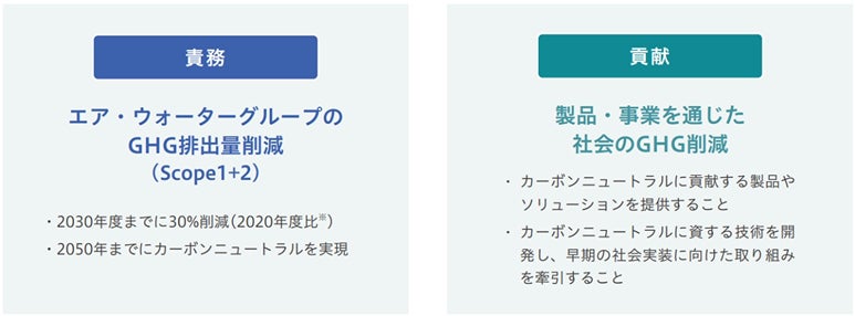 当社グループは、カーボンニュートラルをはじめとした地球環境問題への対応を「企業の社会的責任」としてだけではなく「成長の機会」につなげるため、自社の温室効果ガス(GHG)排出量を減らす「責務」と、製品・事業を通じた社会のGHG排出量削減への「貢献」の両面から、社会のカーボンニュートラル化に取り組んでいます。