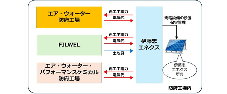 このたび、当社グループは伊藤忠エネクス株式会社(代表取締役社長CEO:吉田朋史)と電力購入契約を締結し、産業ガスプラントやファインケミカル素材製造工場が立地する防府工場(山口県防府市)内に、オンサイトPPAスキーム※¹を活用して4MW級のメガソーラー発電設備を導入することとしましたので、お知らせいたします。2025年3月に着工、同年12月より稼働を開始する予定です。なお、産業ガス(エアセパレートガス)プラントへのオンサイトPPAスキームによる大規模太陽光発電設備の導入は国内初※²となります。