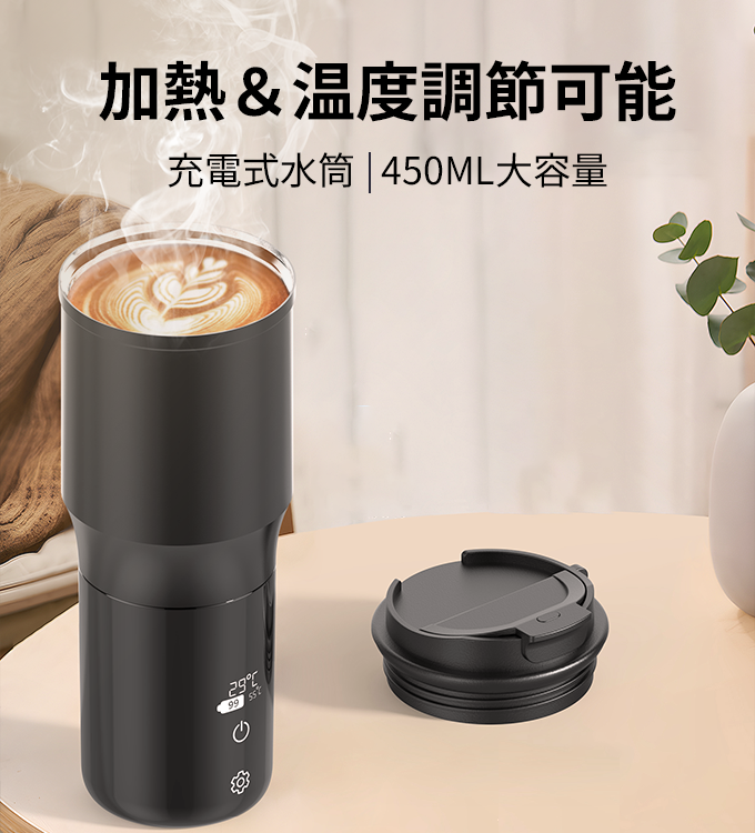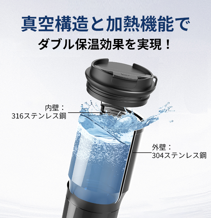 「EreBoto」はインテリジェント温度管理システムを搭載しており、ボトル内の飲み物を正確に温度検知し、素早く加熱できます。わずか約10分で冷たい飲み物を心地よい温かさ(60℃)に変えることが可能です