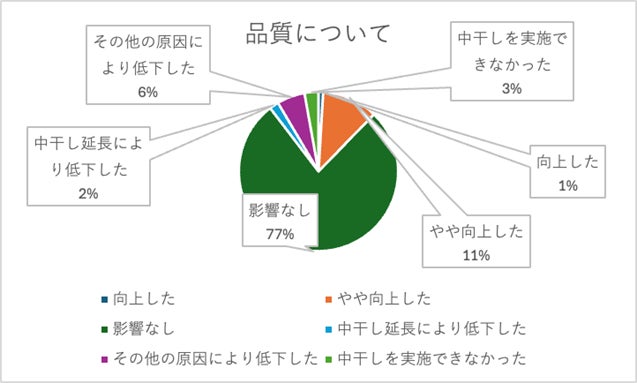 2024年度稲作コンソーシアムにて中干し延長に取り組んでいただいた農家さんを対象にアンケートを行い、品質に影響なしと回答した農家は7割を超え、1割の農家が品質の向上を実感していると回答。