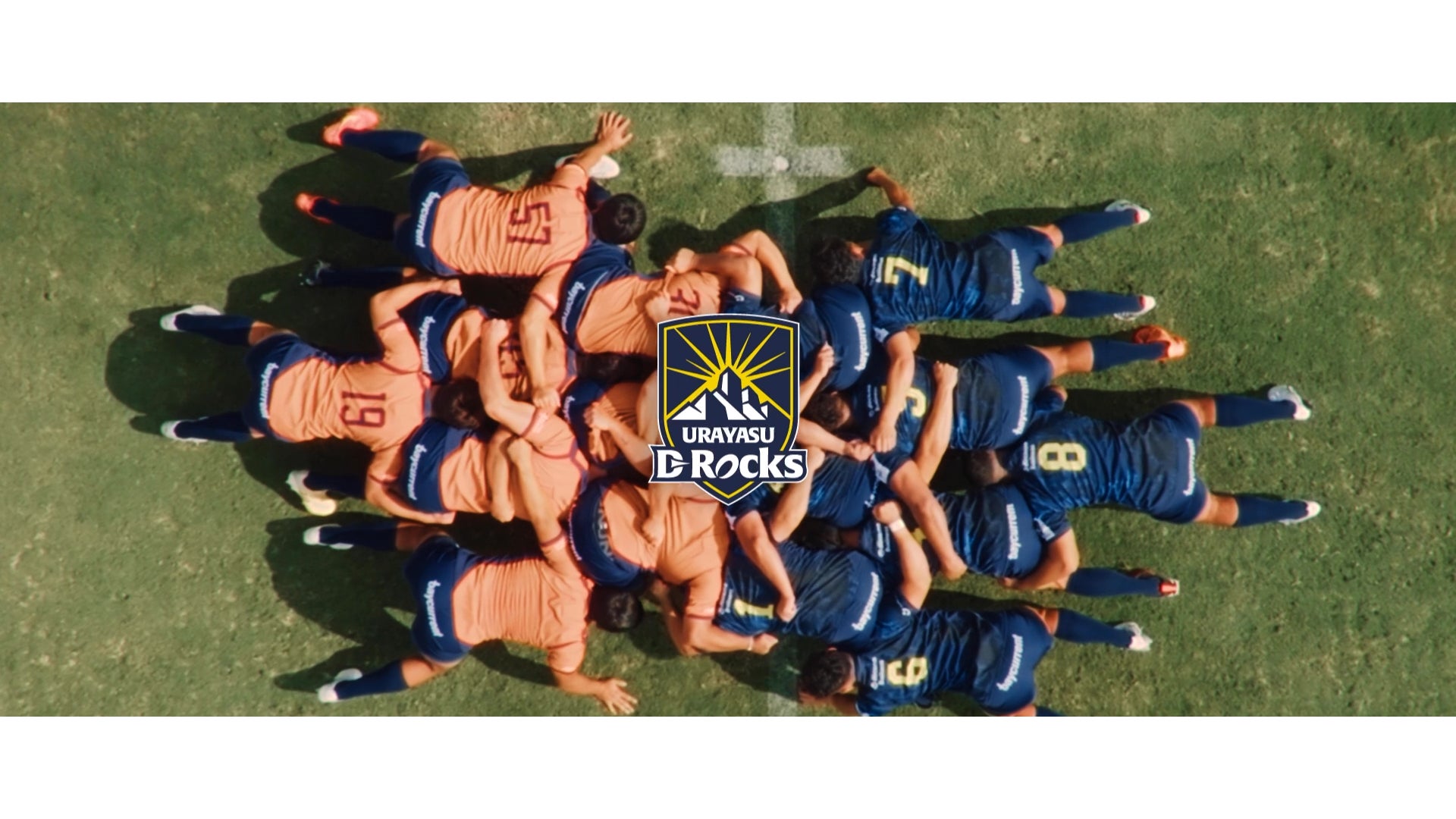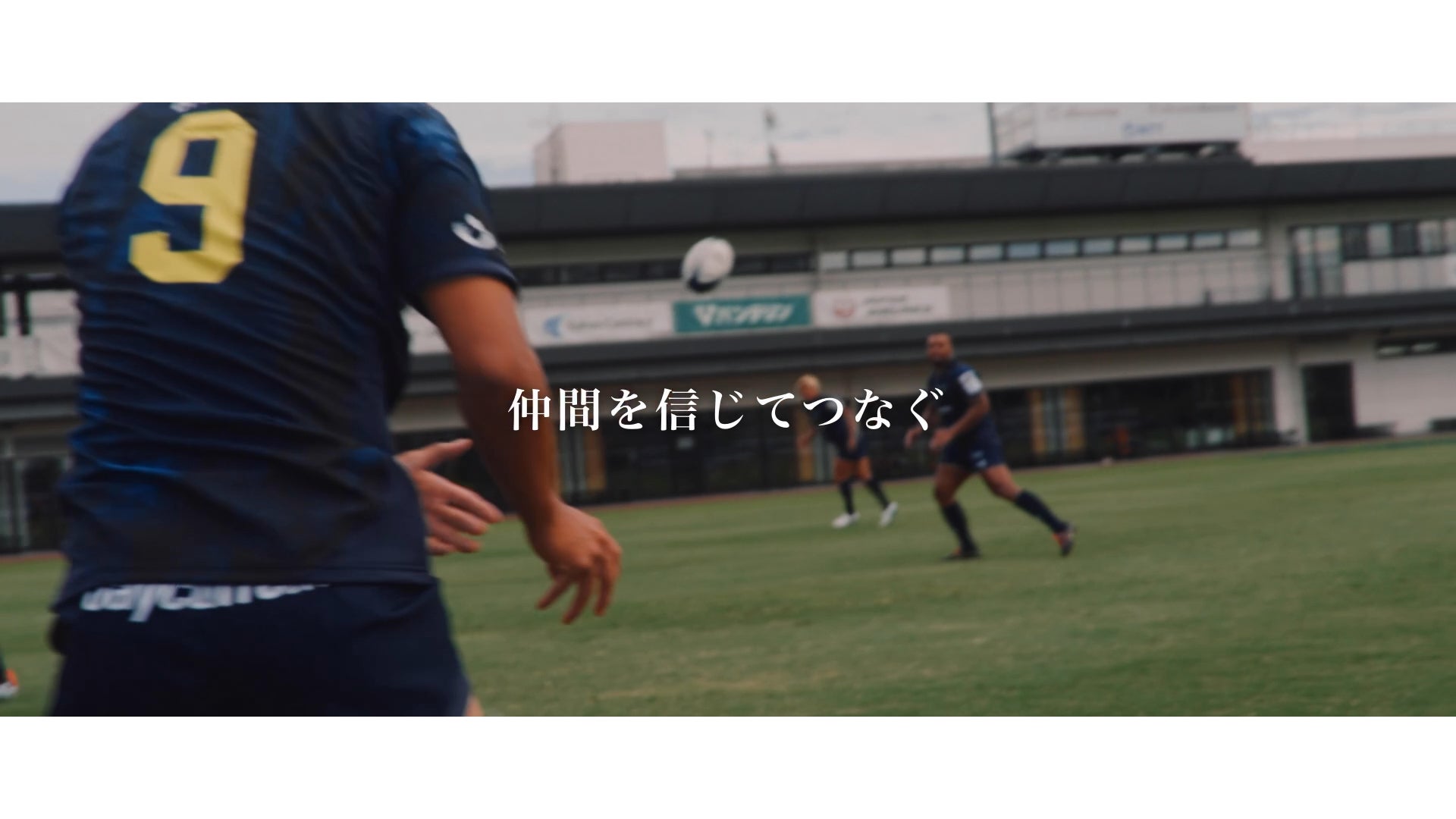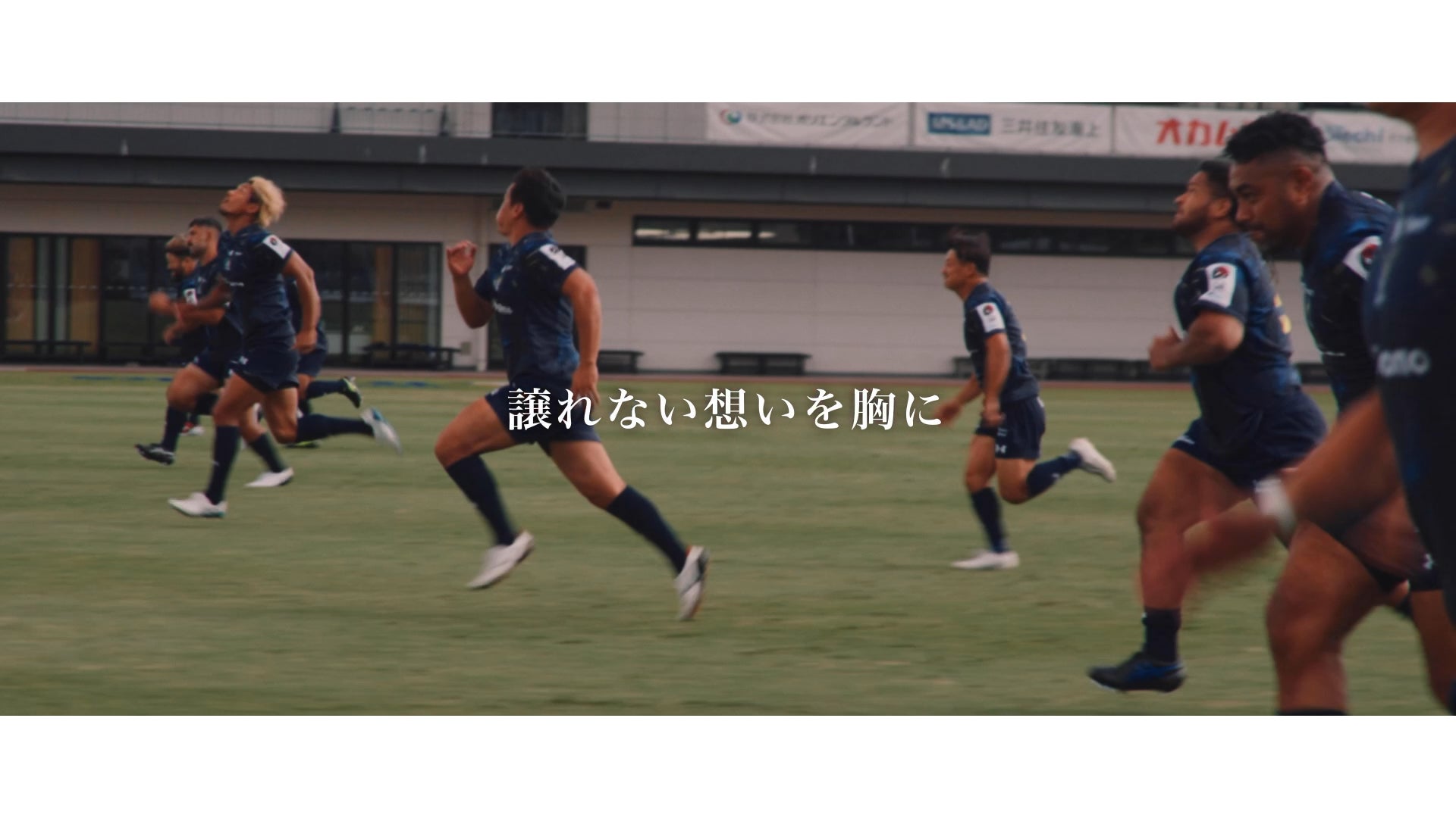 冒頭:ラグビーを象徴するプレー「スクラム」からスタート。立ち上がる力、挑戦への覚悟を表現しています。