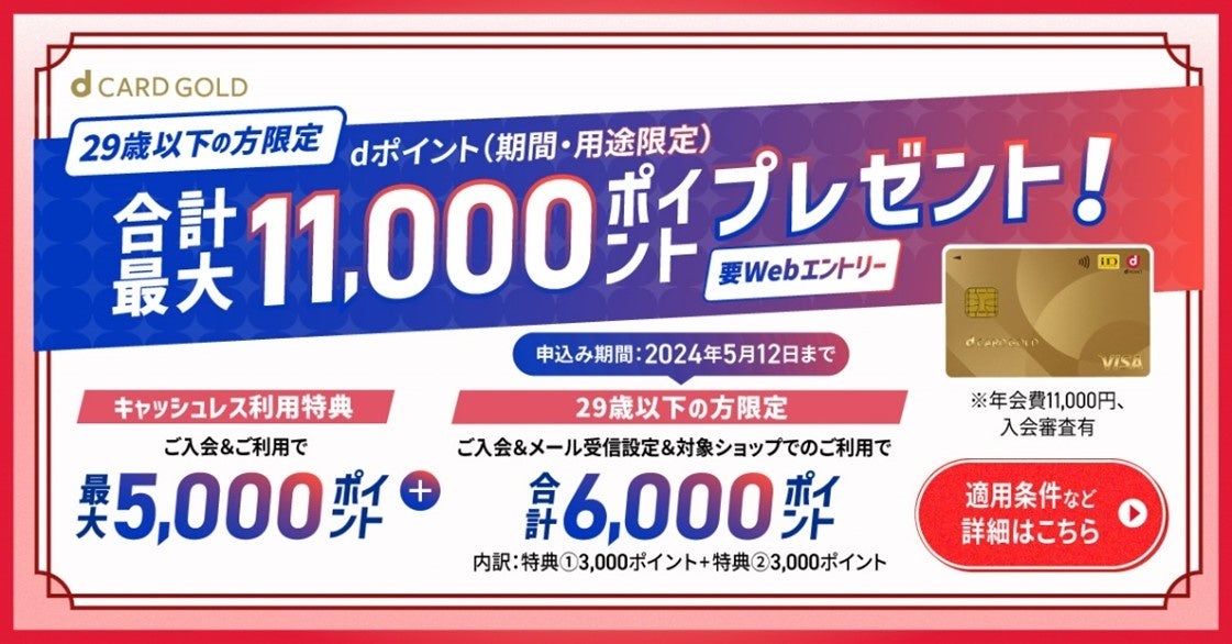 本キャンペーンの参加は、キャンペーンサイトからのエントリー(※3)が必要です。お申込み時点で29歳以下のお客さまがキャンペーン期間中に「dカード GOLD」にお申込み後、お申込月の翌々月までにご入会し、dカードお得情報メールの受信設定の上、「dカード GOLD」で対象の決済をされた場合、dポイント(期間・用途限定)を3,000ポイント進呈いたします。対象となる決済は、対象のネットショッピングもしくは対象のdカード特約店(※4)でのご利用です。両方ご利用いただいた場合、合計6,000ポイント進呈となります。キャンペーンの詳細についてキャンペーンサイトをご確認ください。