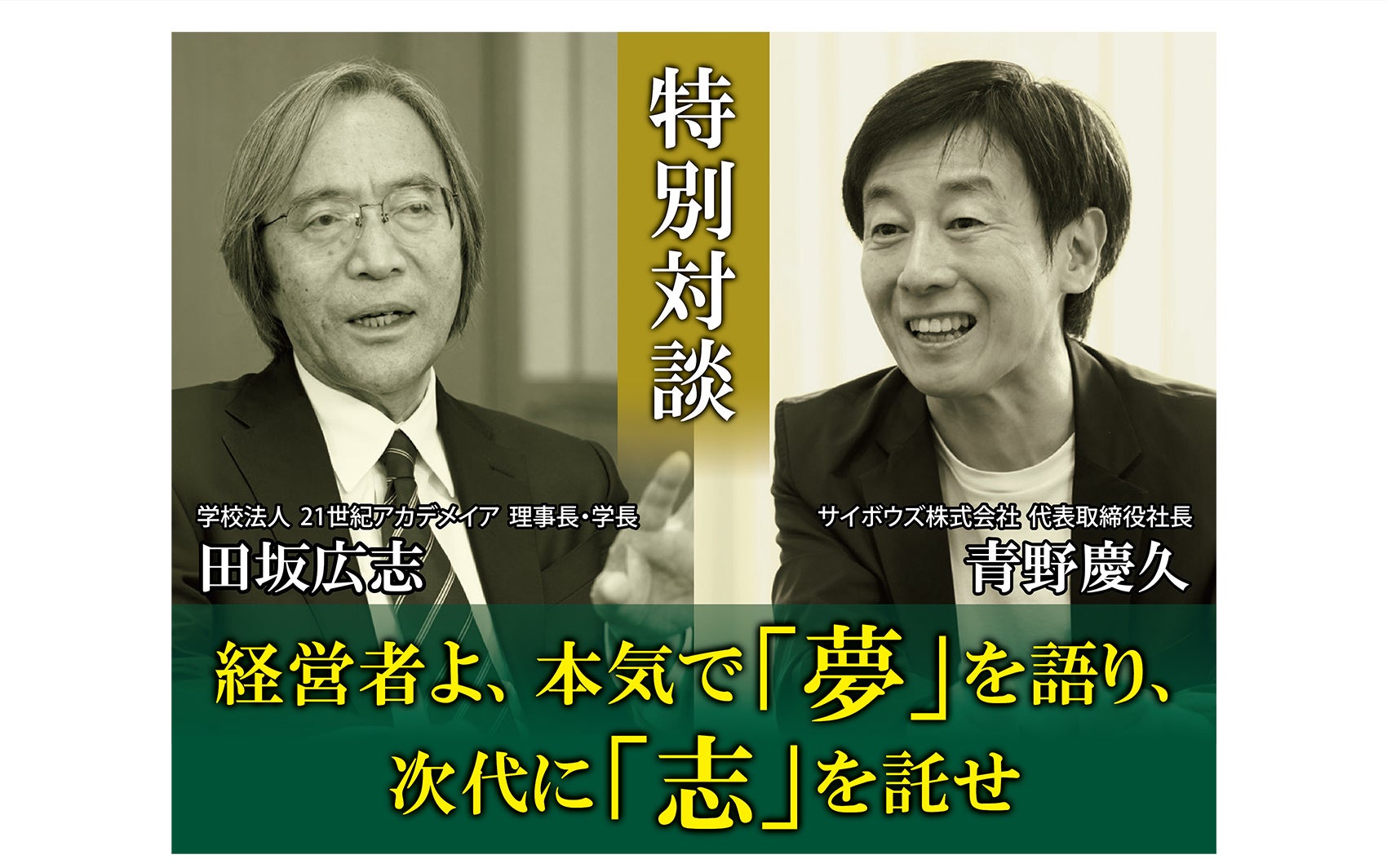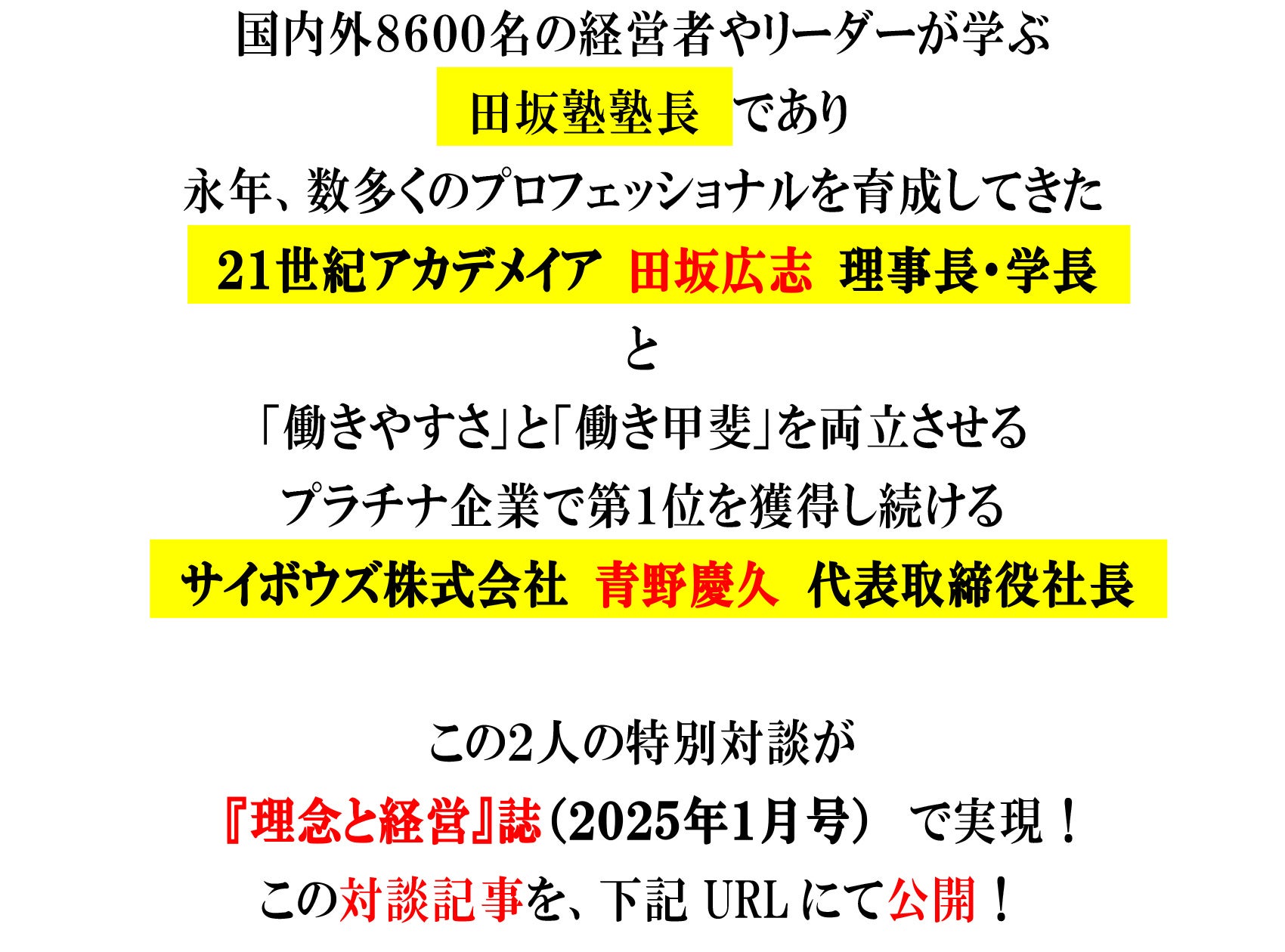 AI革命の時代に求められる経営者の条件とは? 21世紀アカデメイア 田坂広志 学長と サイボウズ株式会社 青野慶久 社長の特別対談が 『理念と経営 2025年1月号』 で実現! この対談記事を公開!