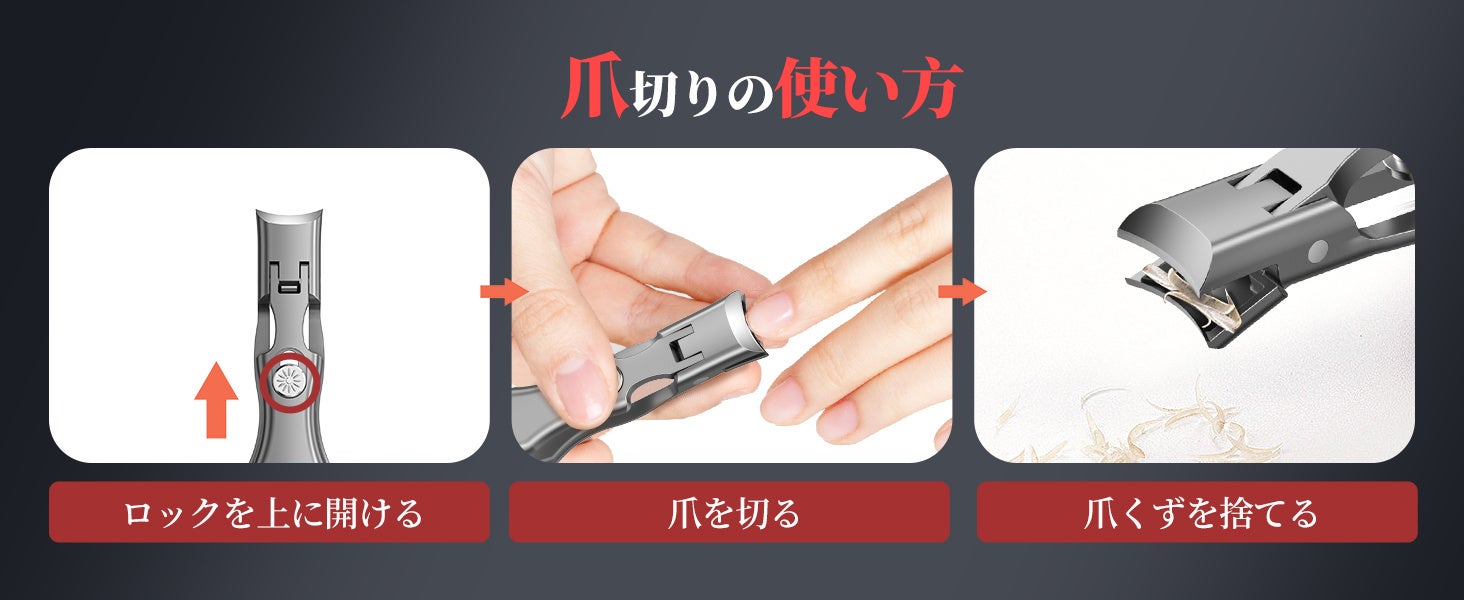 爪切りはワンクリックで簡単に開く設計で、少ない力でしっかり爪を切ることができます。軽い力で握るだけで、硬い爪もスムーズにカットでき、力の弱い方やご年配の方でも手軽にお使いいただけます。