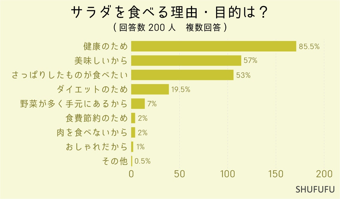 サラダを食べる理由・目的では「健康のため」が最多でした。体内で生成されない栄養素が野菜には含まれているので、健康のためにもしっかり食べたいですね。
