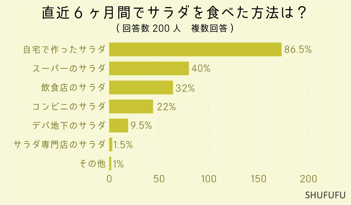 直近6ヶ月間でサラダを食べた方法に関しては1位「自宅で作ったサラダ(86.5%)」、2位「スーパーのサラダ(40%)」でした。家でサラダを作るだけではなく、スーパーで出来合いのものを買ったり、外食の際もサラダを食べている方も多いようです。