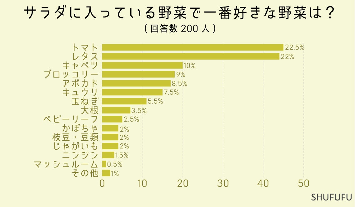 サラダに入っている野菜で一番好きな野菜の問いに対して最も多かったのが「トマト(22.5%)」でした。 次いで「レタス(22%)」「キャベツ(10%)」という結果でした。 サラダといえばレタスとトマトが思い浮かびますが、次いでキャベツが人気があるようでした。