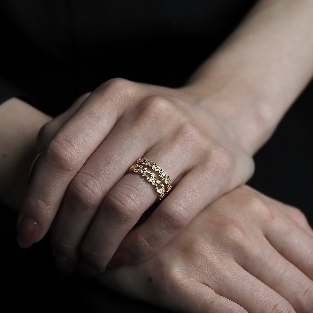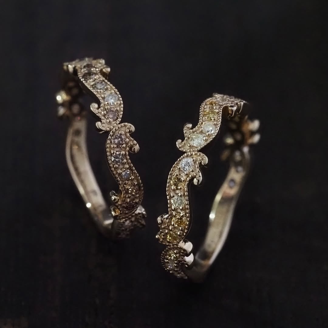 人気のミルゴシックシリーズに、リボンモチーフの新作が登場。アンティークジュエリーにみられる繊細なミルグレインを、K9のやわらかなイエローゴールドで丁寧に再現しました。今回のトランクショーでは、通常展開していないナチュラルカラーダイヤモンドをランダムにミックスして留めた、特別仕様のスペシャルピースをご紹介します。