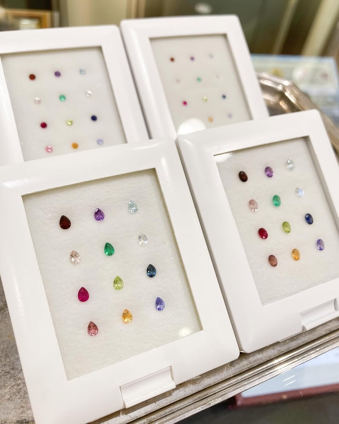 京都店では、1月から12月までの誕生石ルースを豊富にご用意しております。サンクルールに適したサイズやカットのルースを実際にサンプル枠に並べながら、配色をご体験いただけます。色合わせに迷われた際は、スタッフが丁寧にアドバイスいたしますので、初めての方も安心してご参加いただけます。